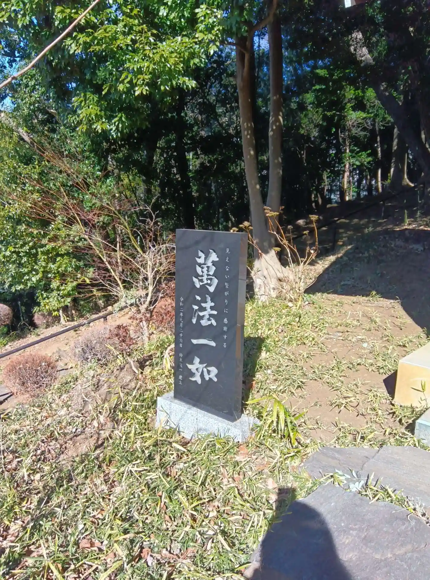 萬法一如(ばんぽういちにょ)とは、宇宙のあらゆる現象や存在(萬法)は、本質的に一つ(如)であるという仏教の根本的な教えとのことです。神社にあるところが面白い。