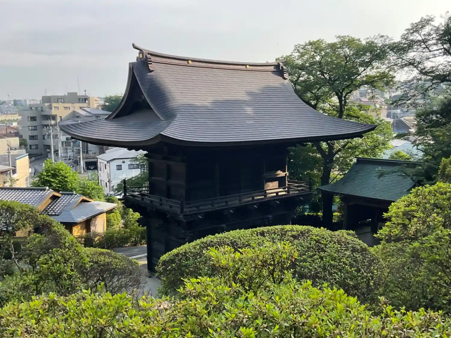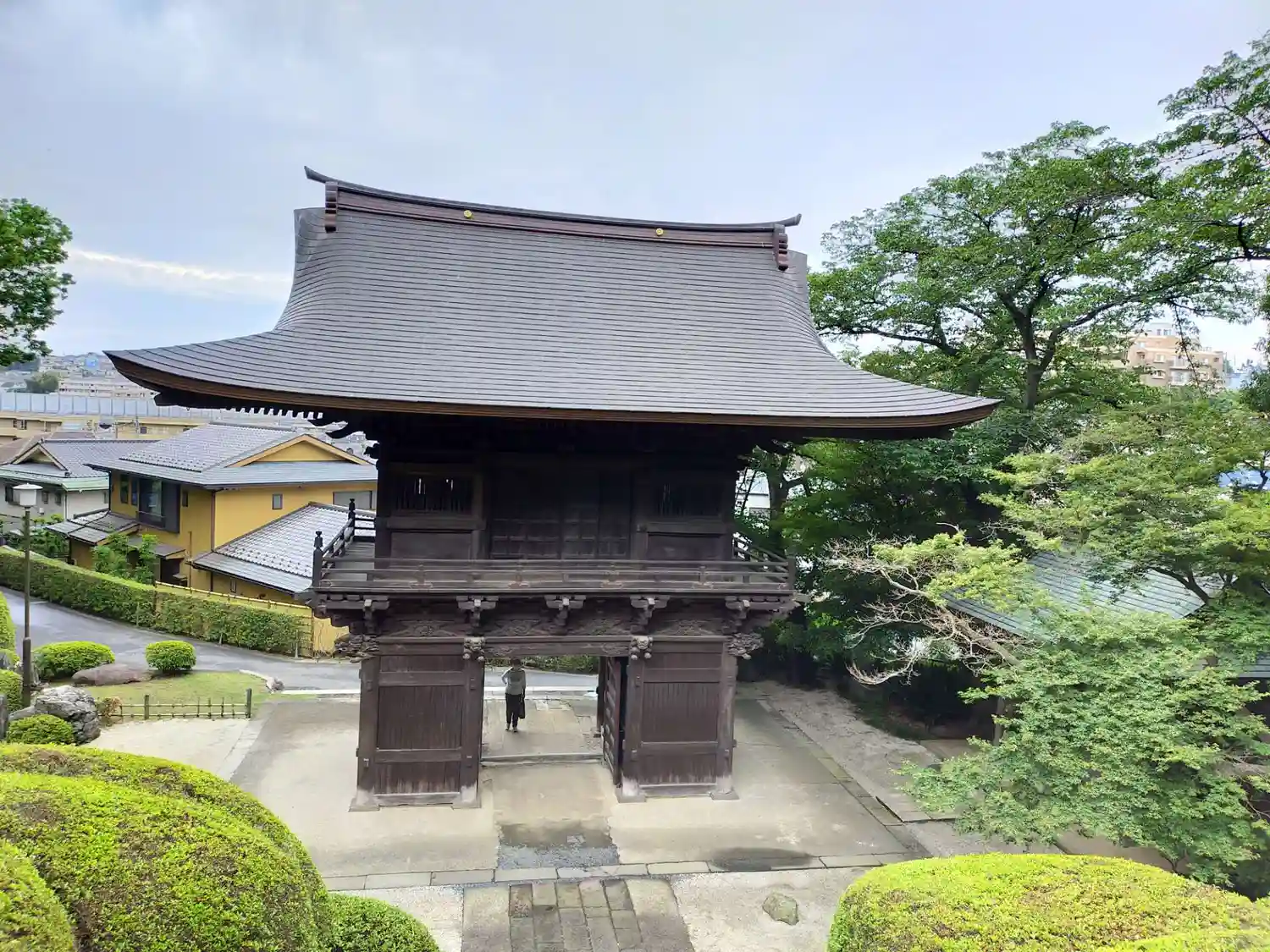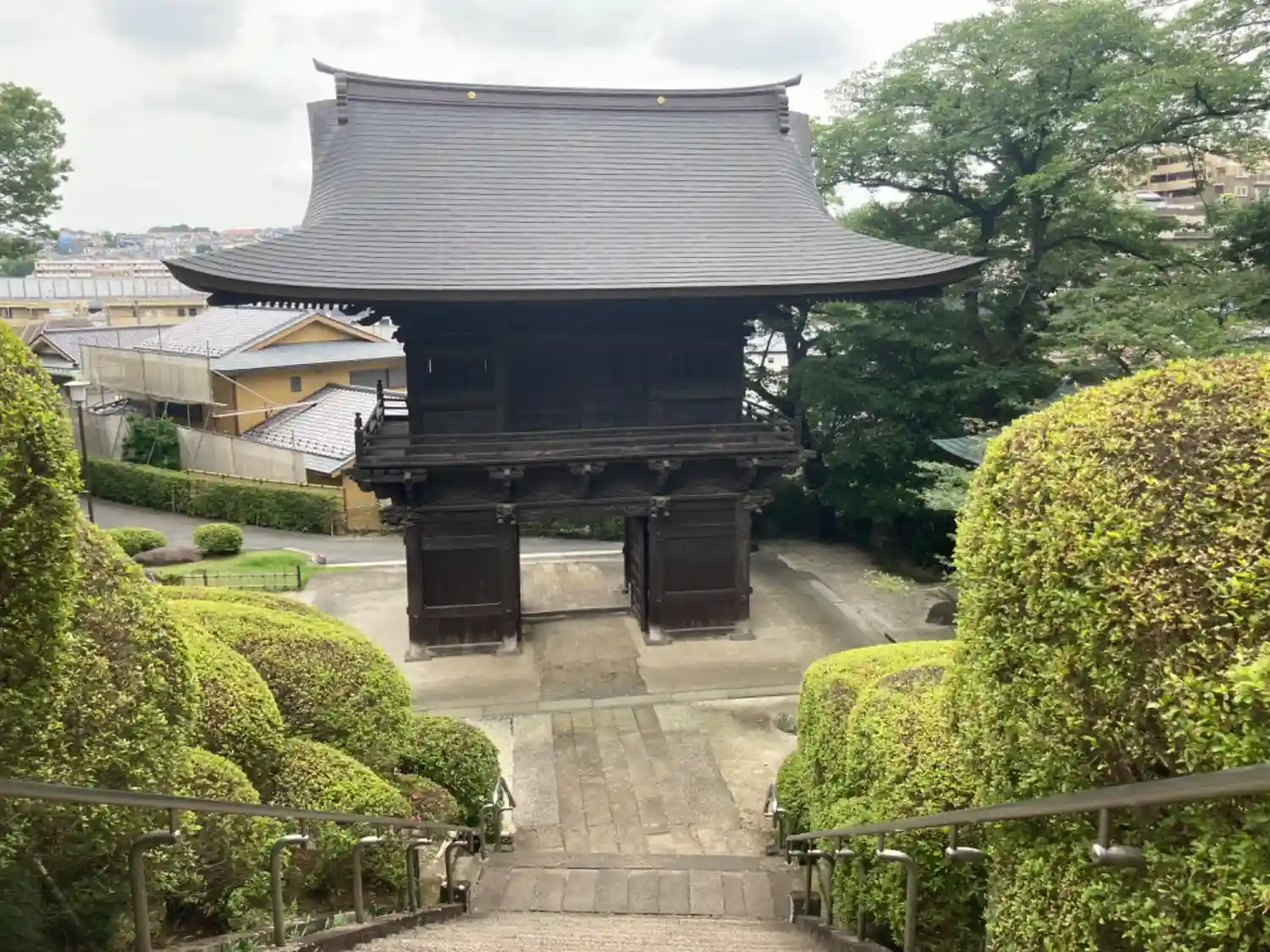 小高い丘からは、住宅地の中に存在を示す山門。