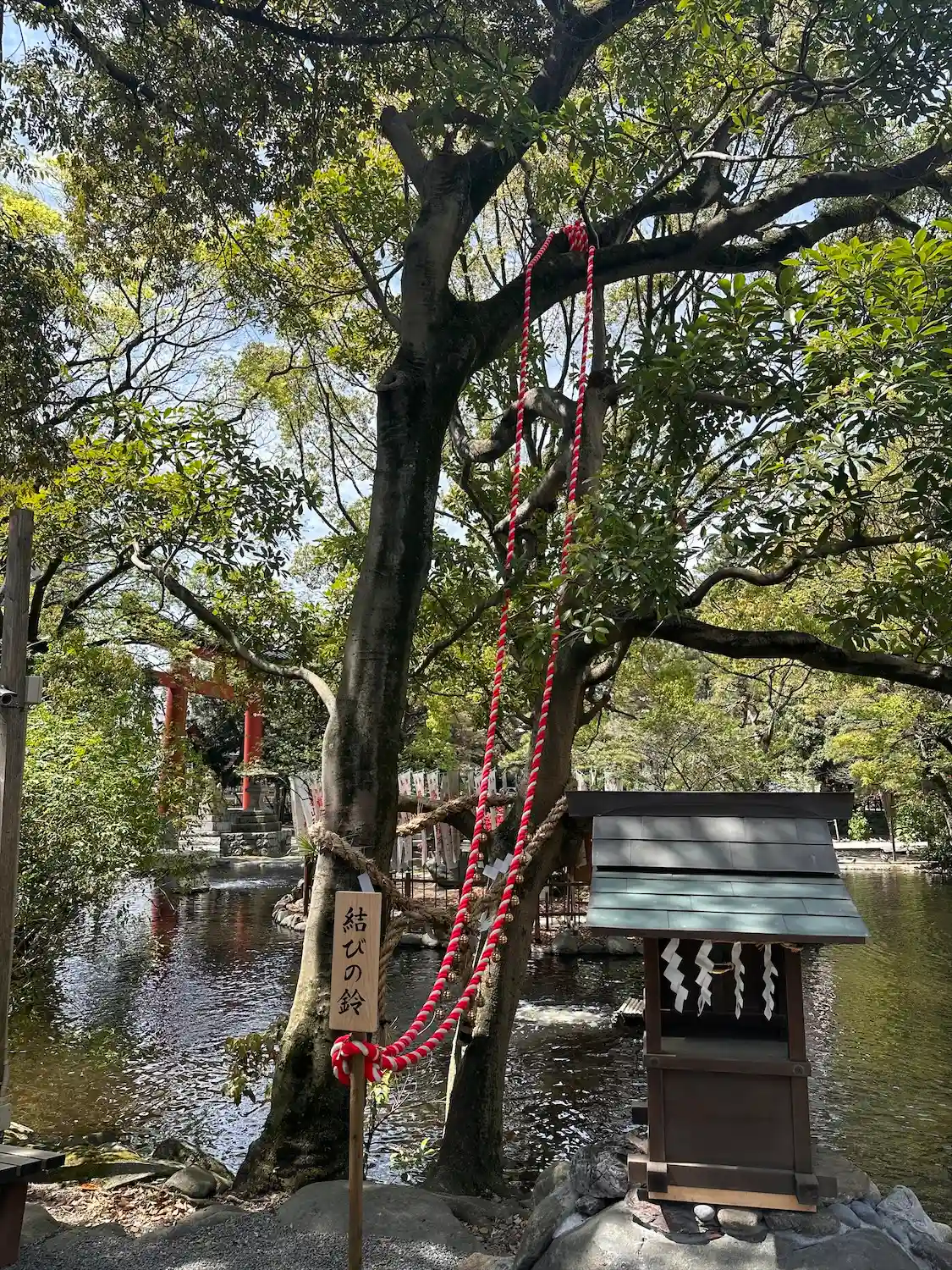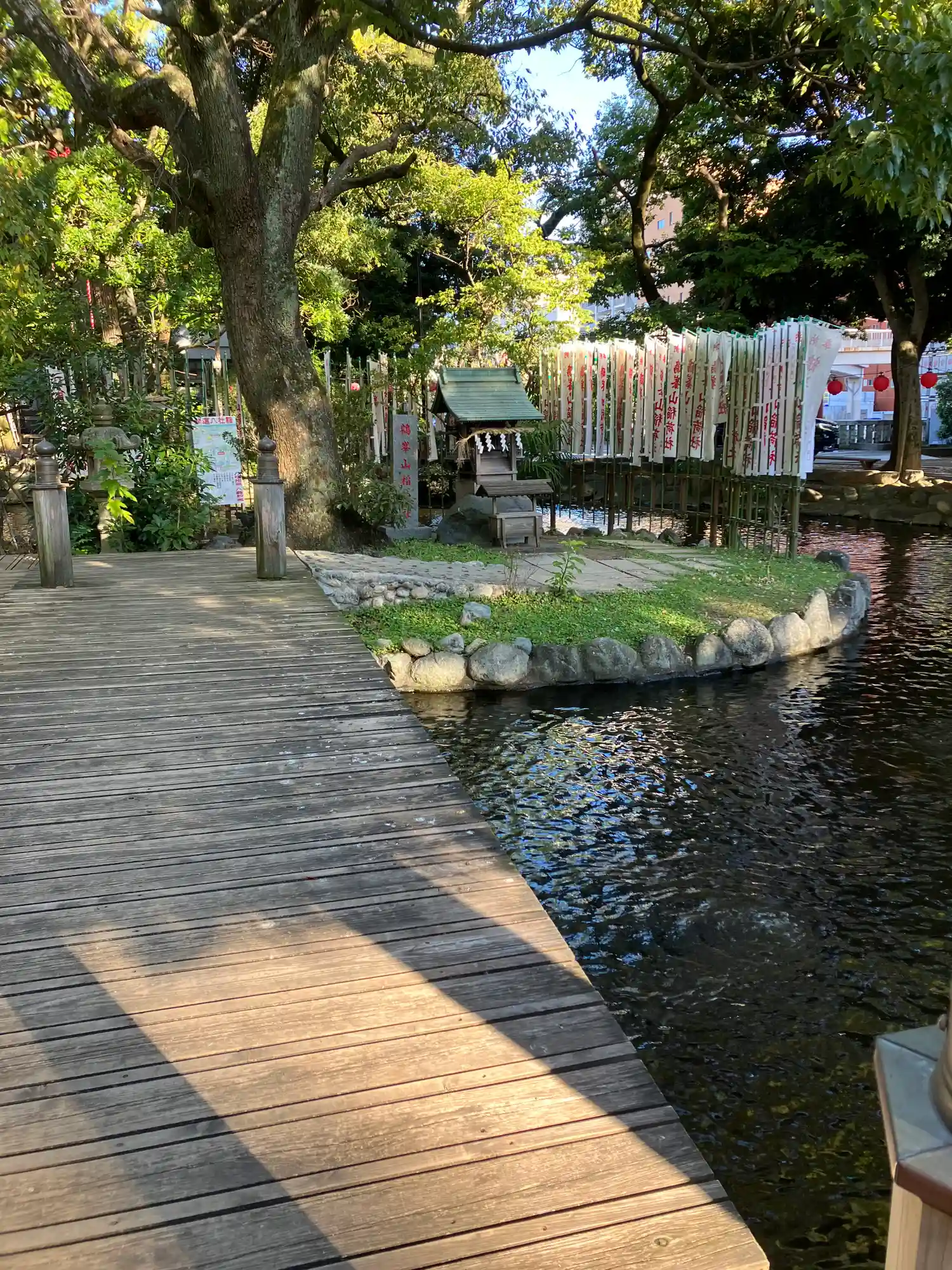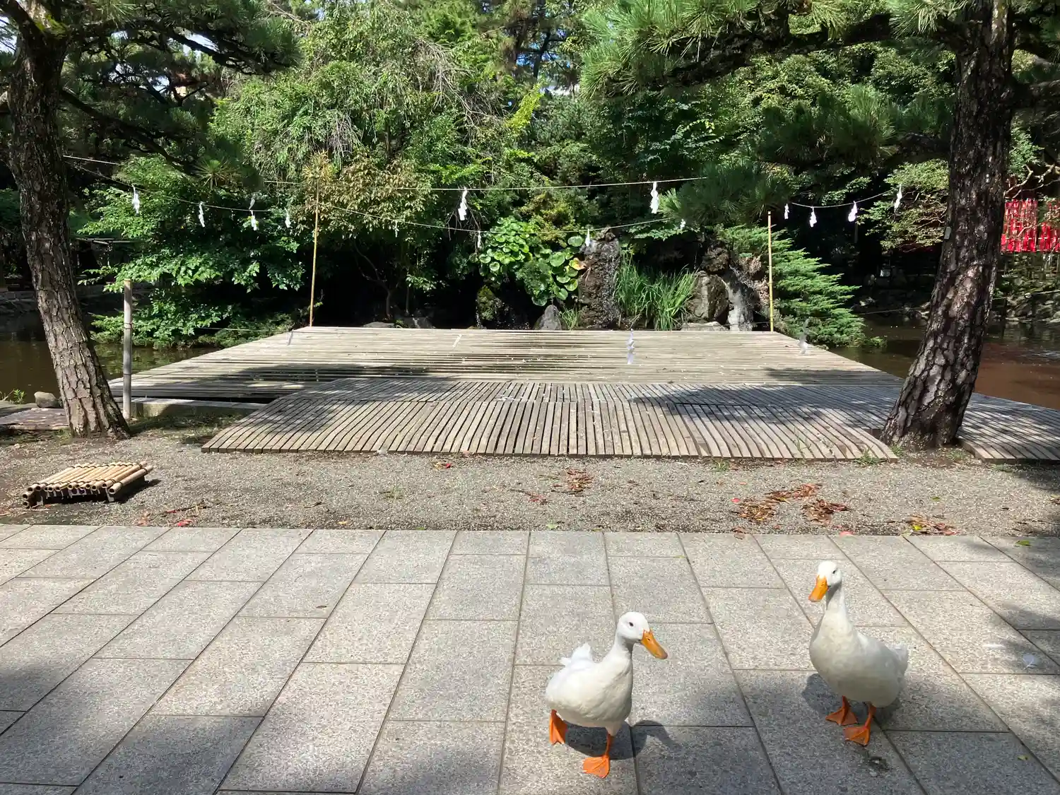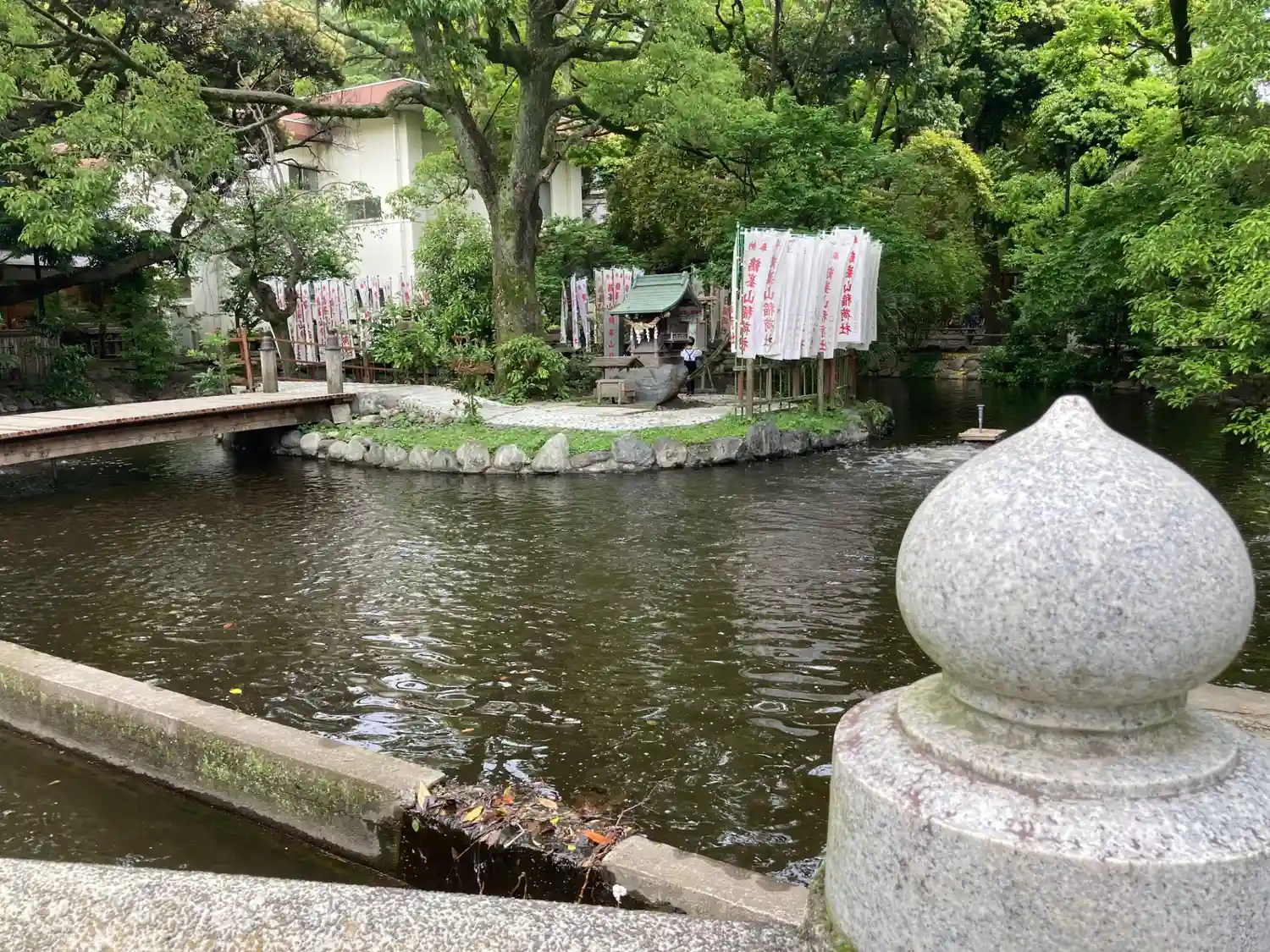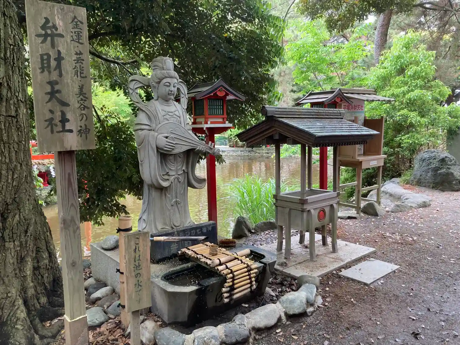 一の鳥居をくぐると、参道両脇に池が広がる。
