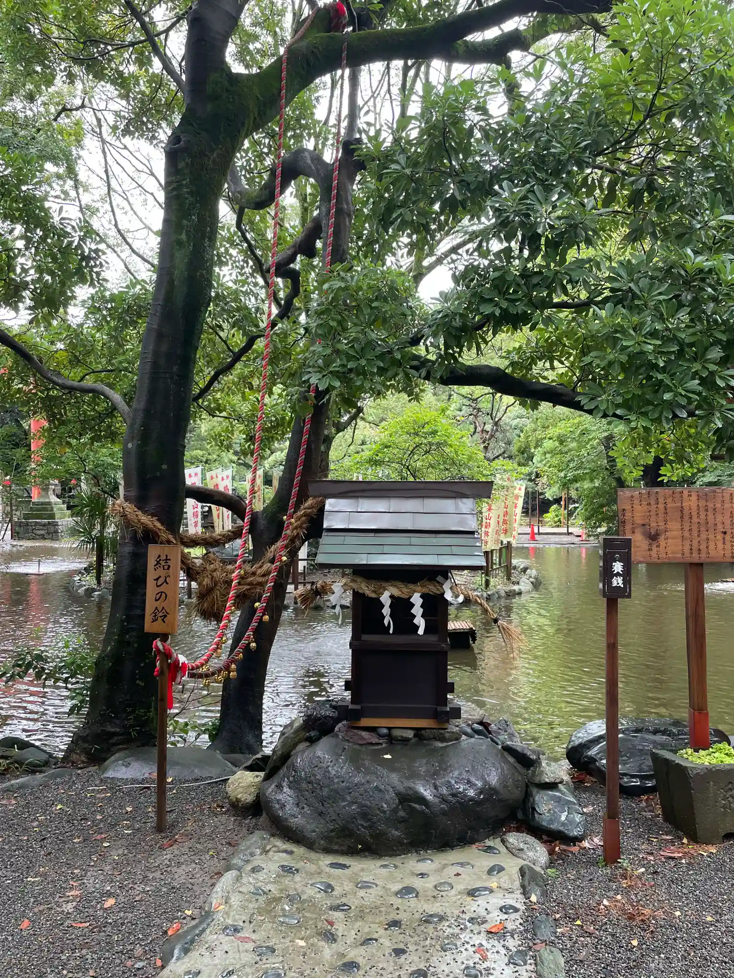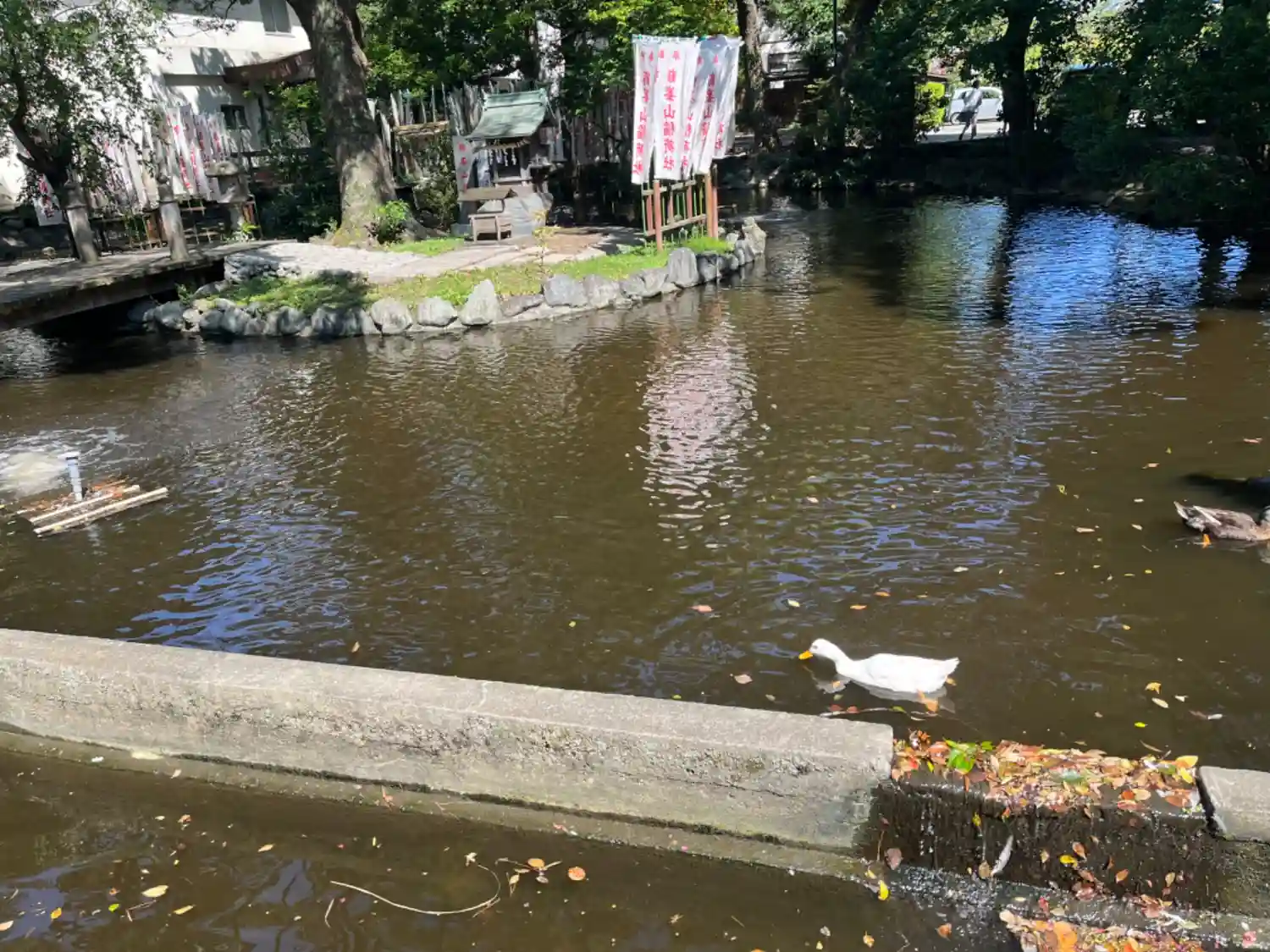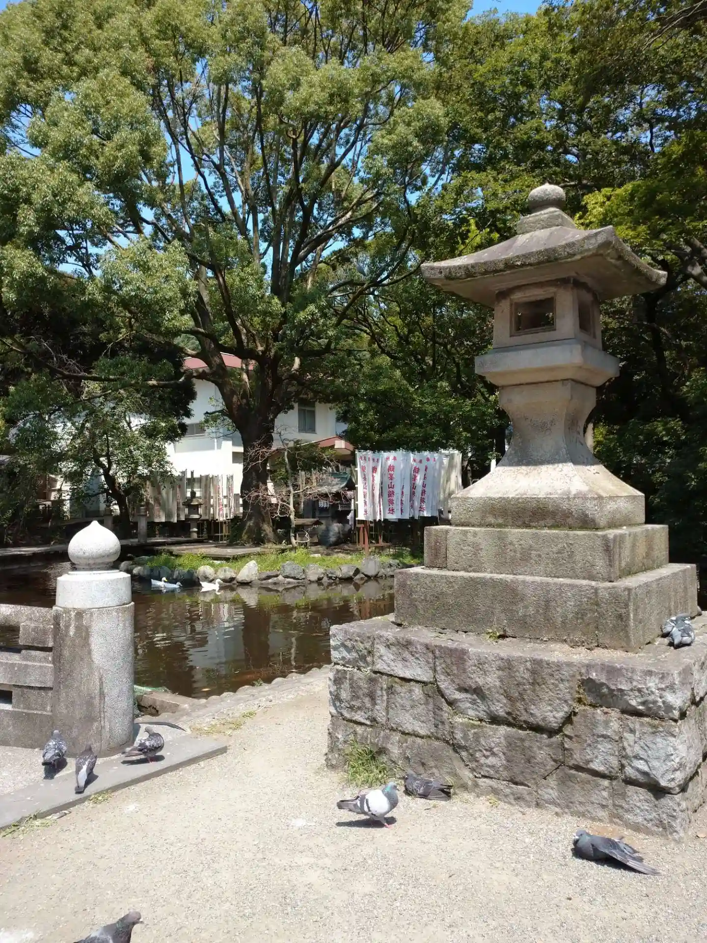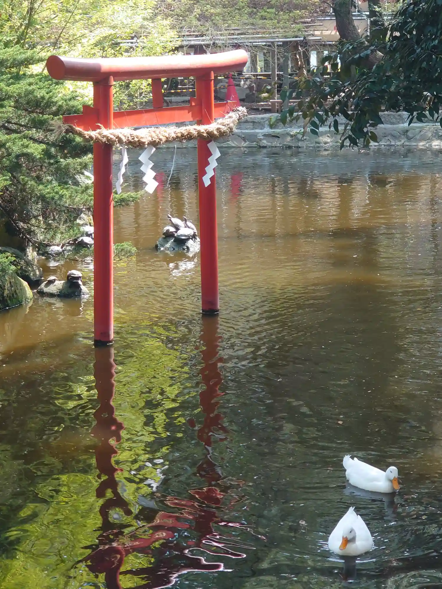 一の鳥居をくぐると、参道両脇に池が広がる。