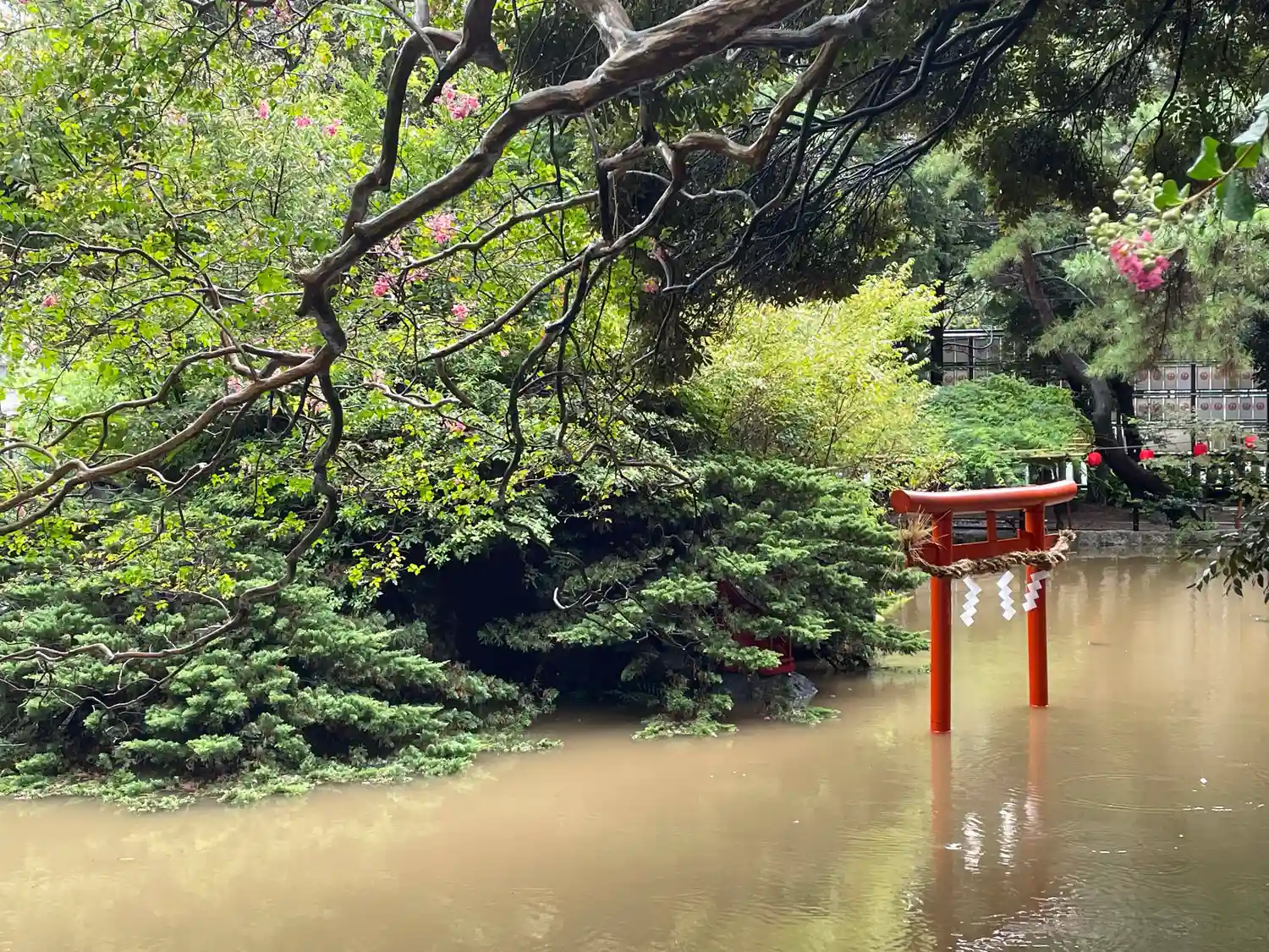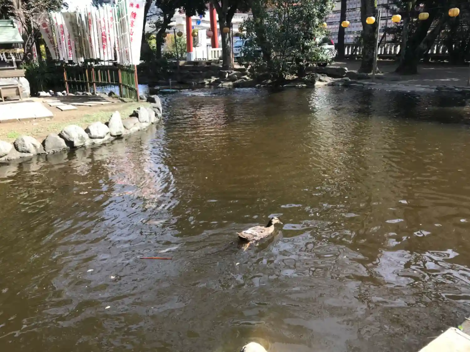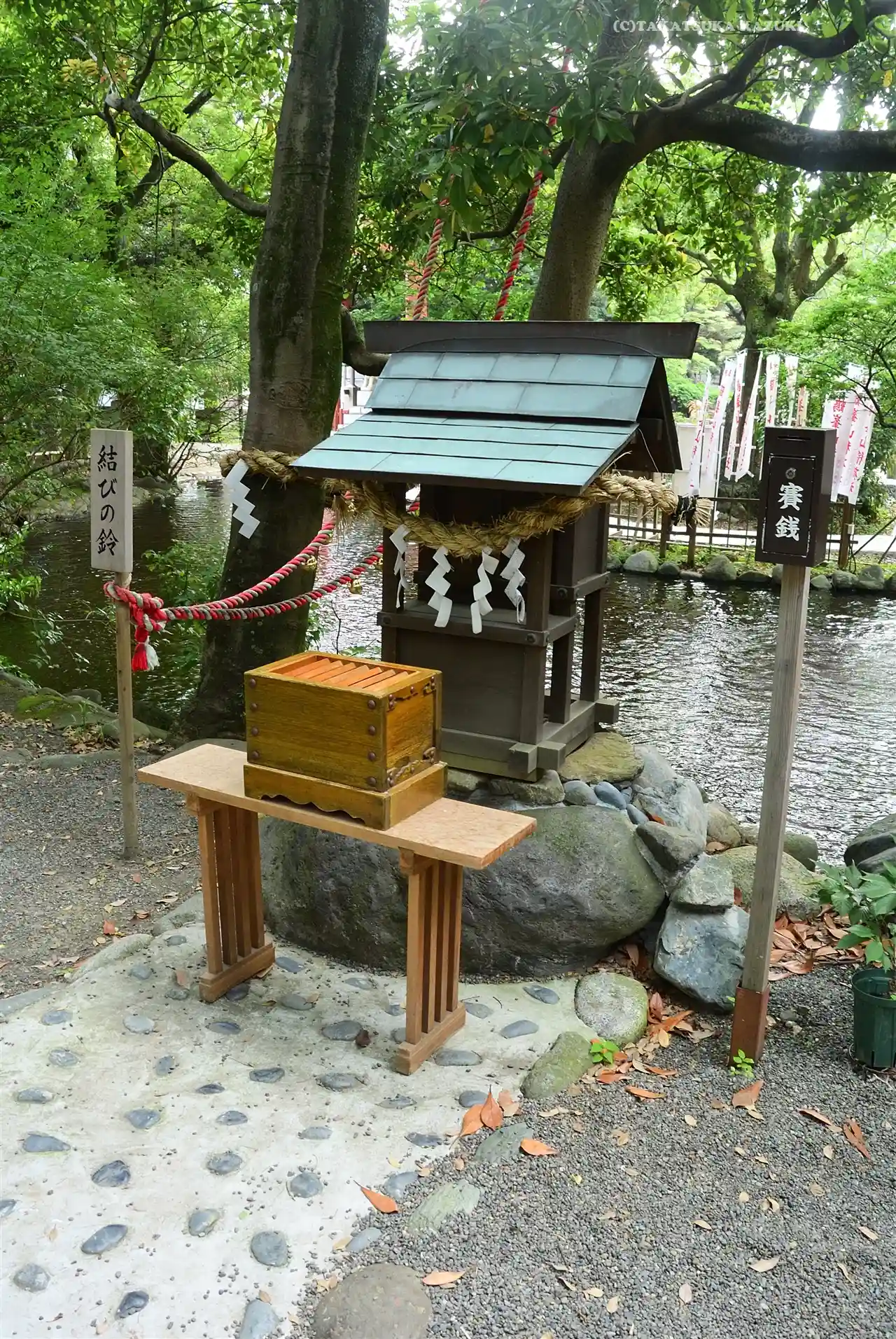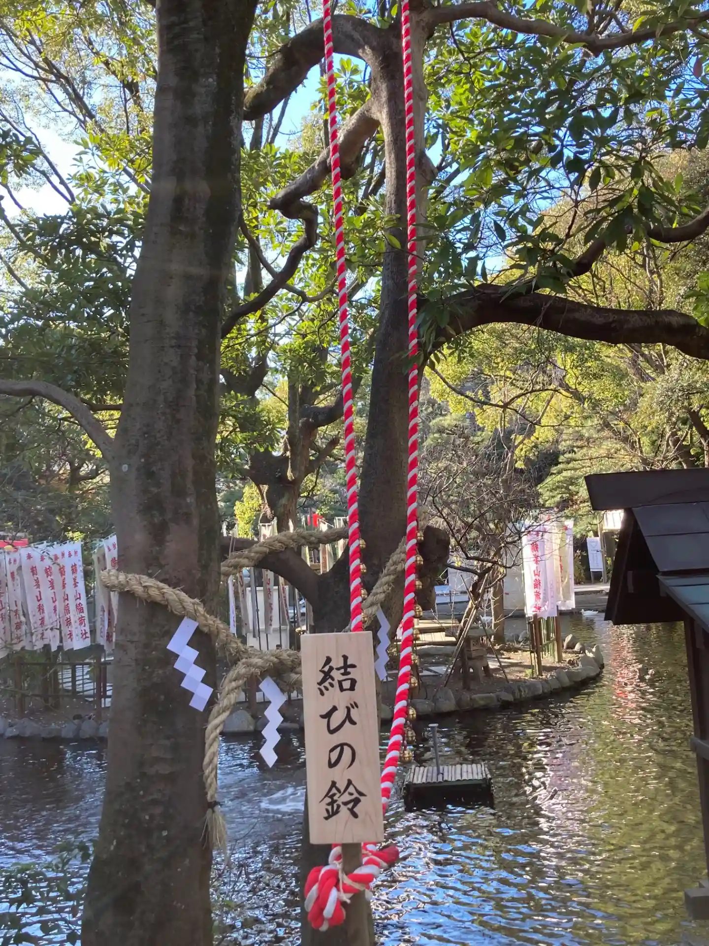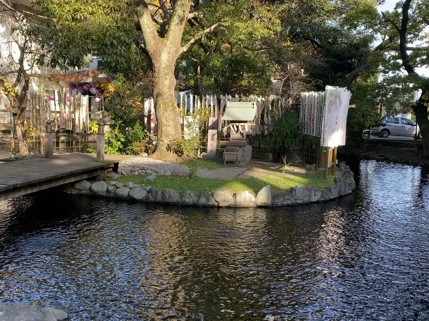 一の鳥居をくぐると、参道両脇に池が広がる。
