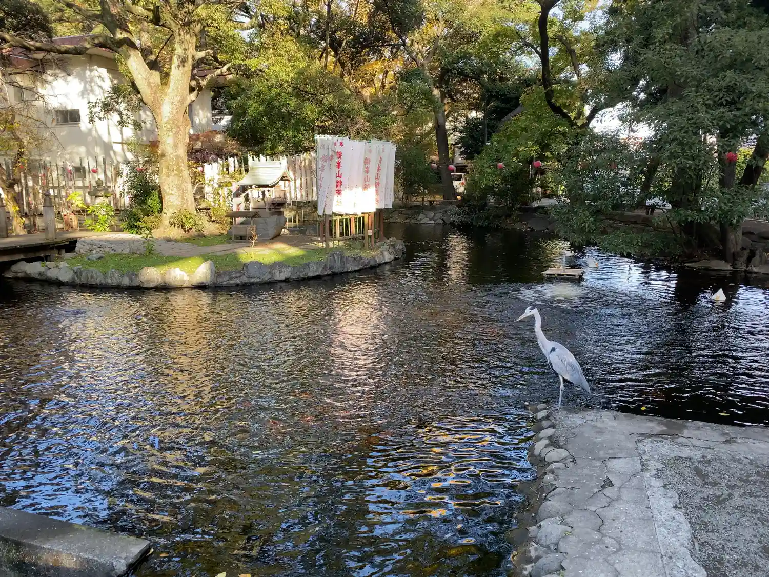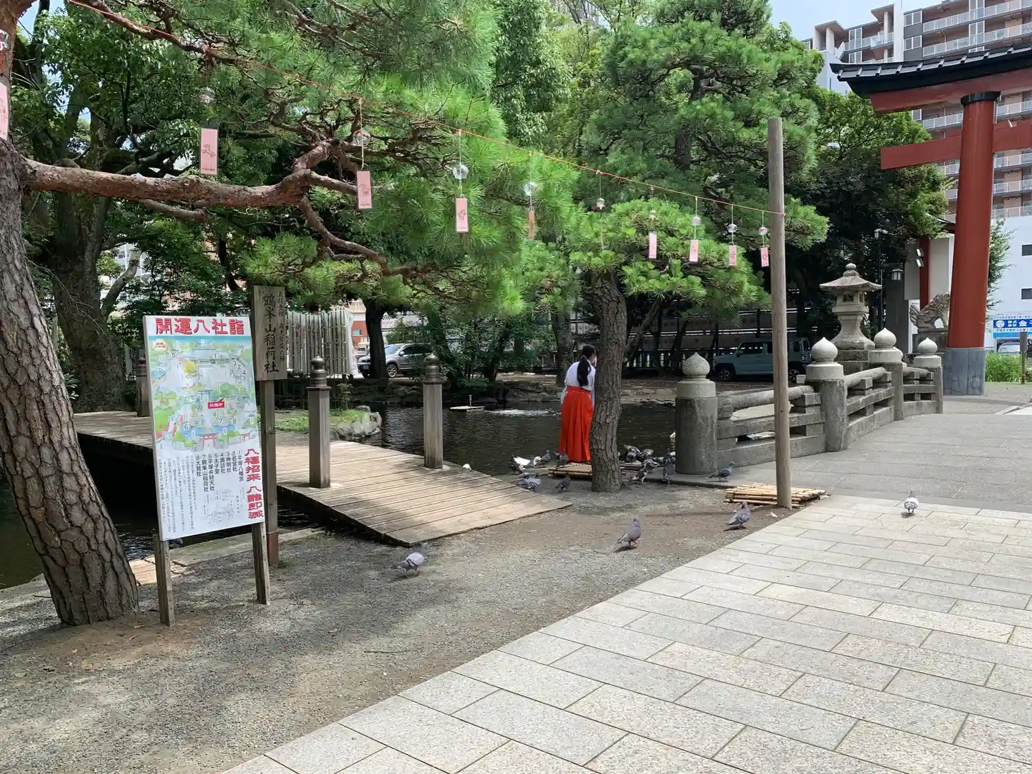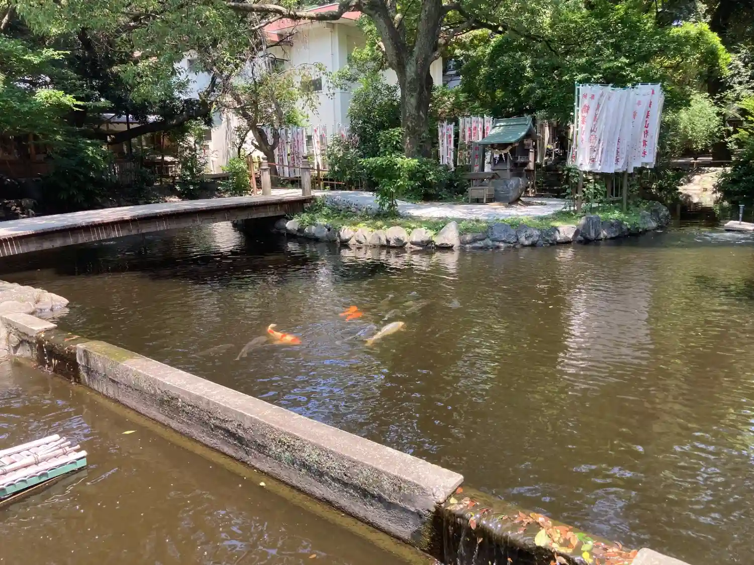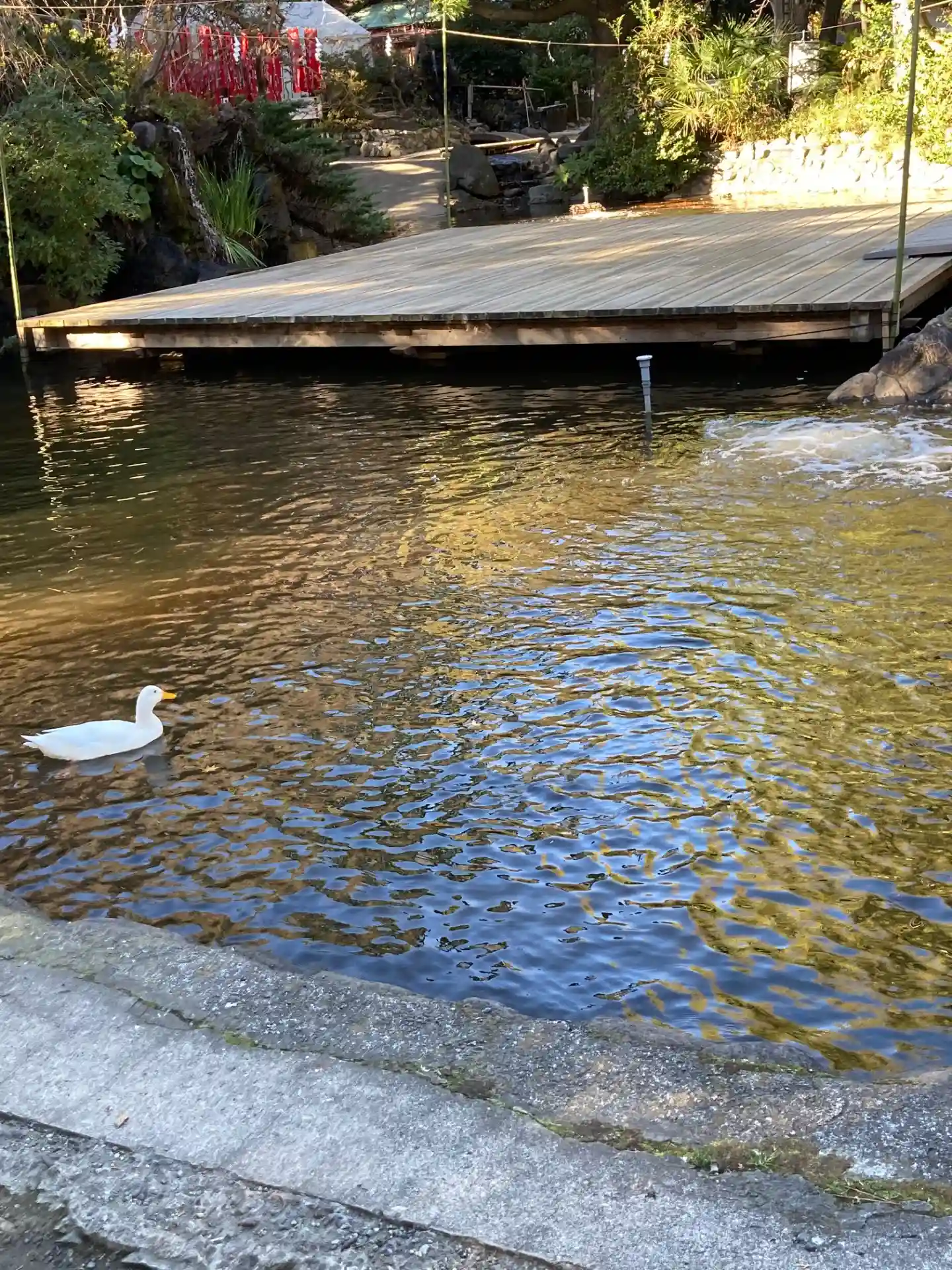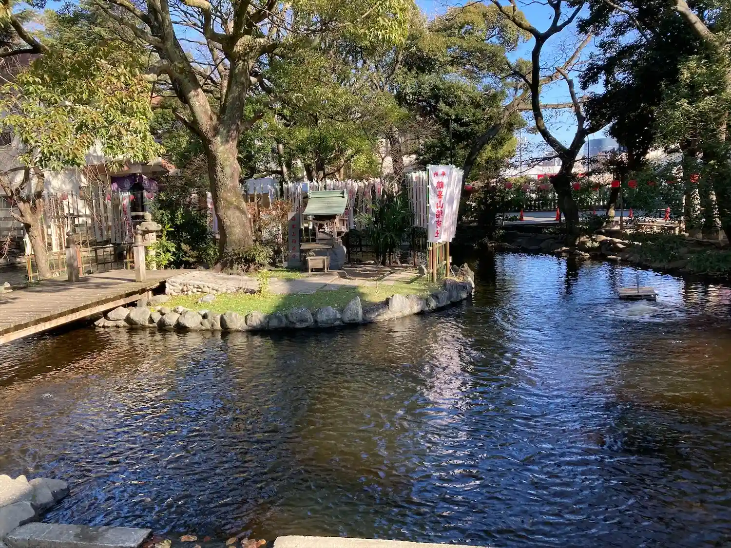 一の鳥居をくぐると、参道両脇に池が広がる。