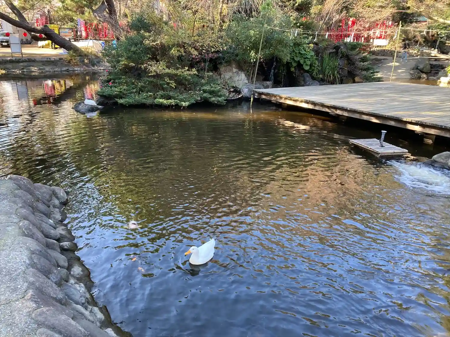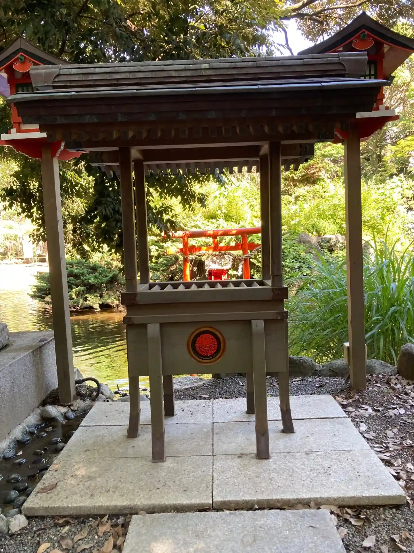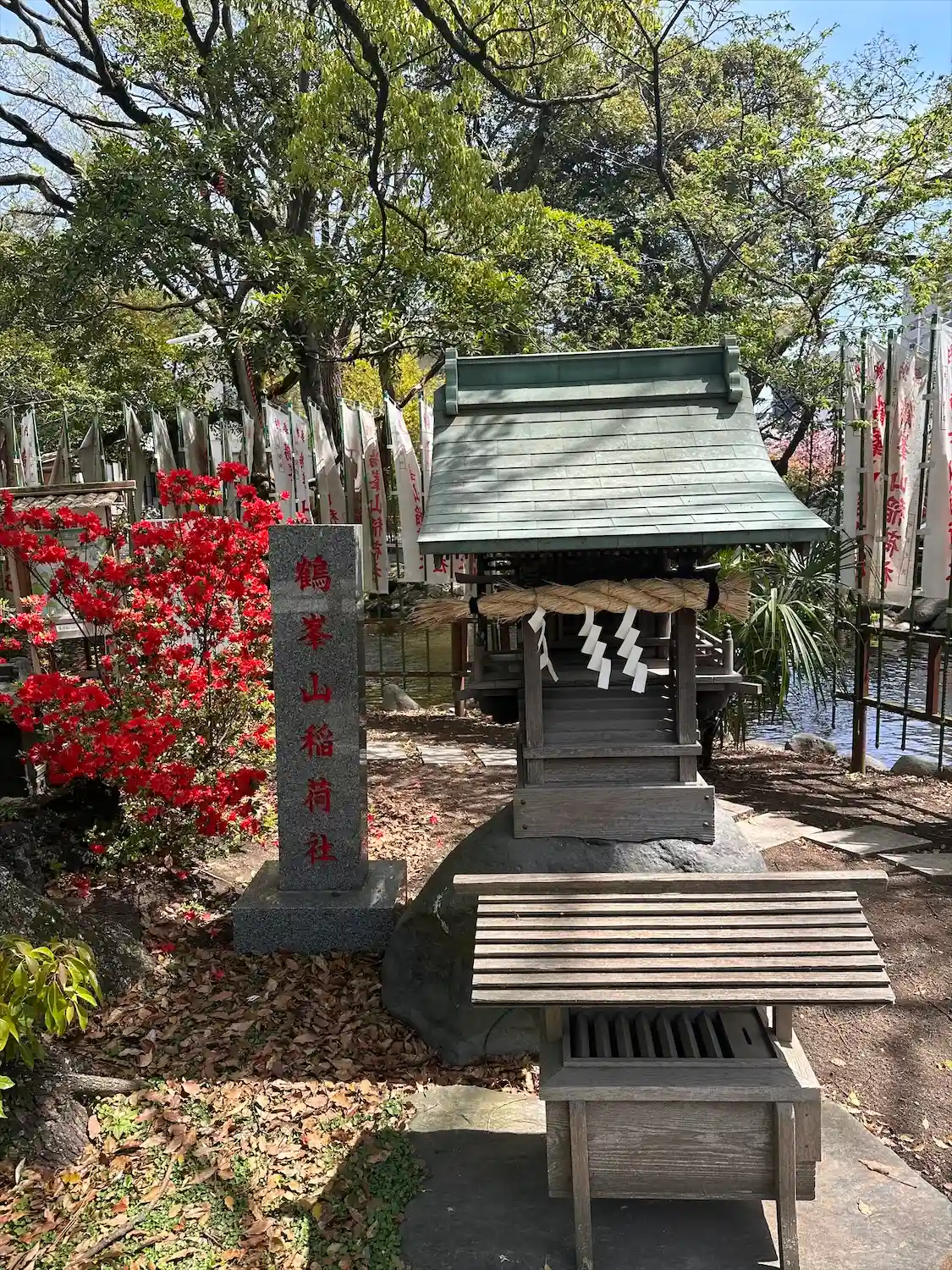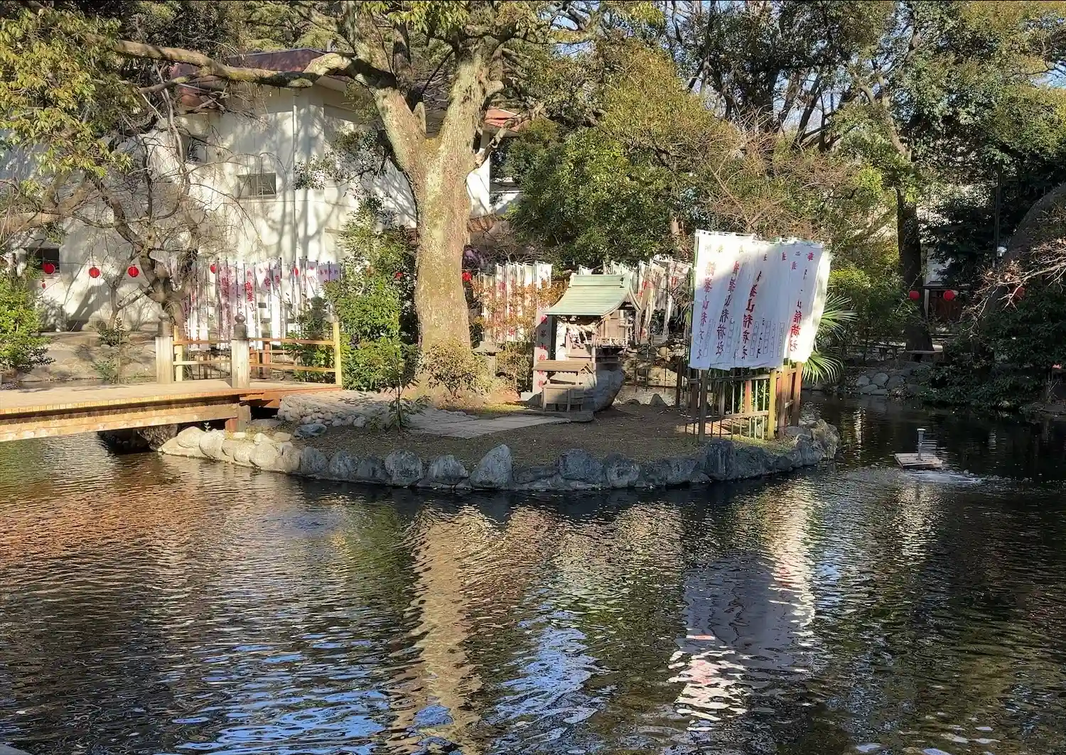 一の鳥居をくぐると、参道両脇に池が広がる。