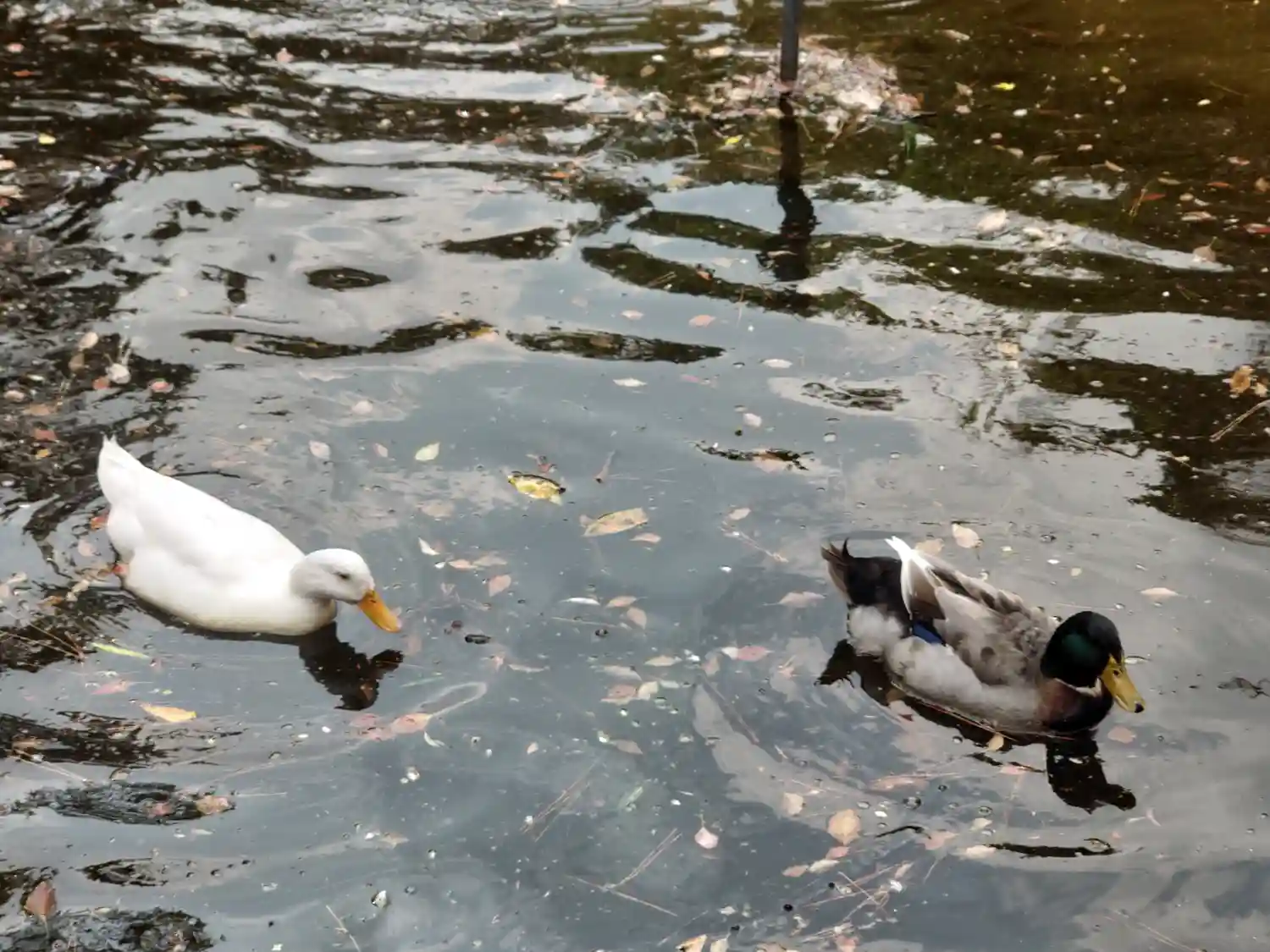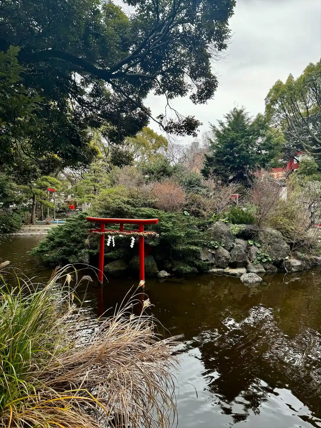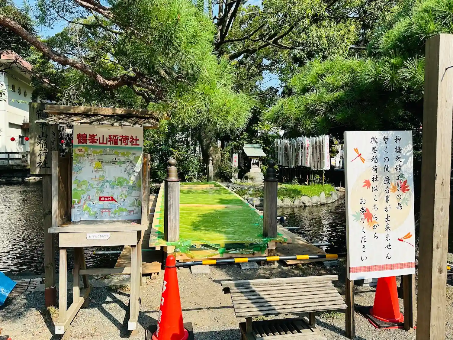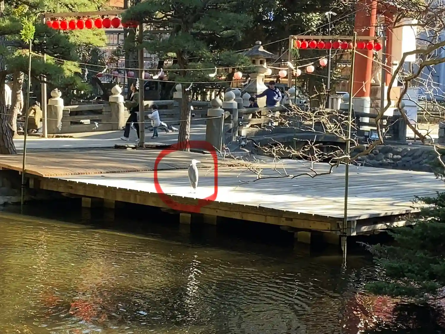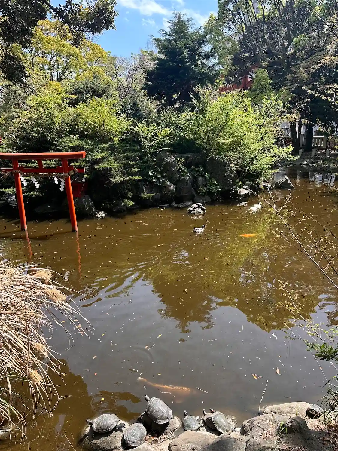 一の鳥居をくぐると、参道両脇に池が広がる。