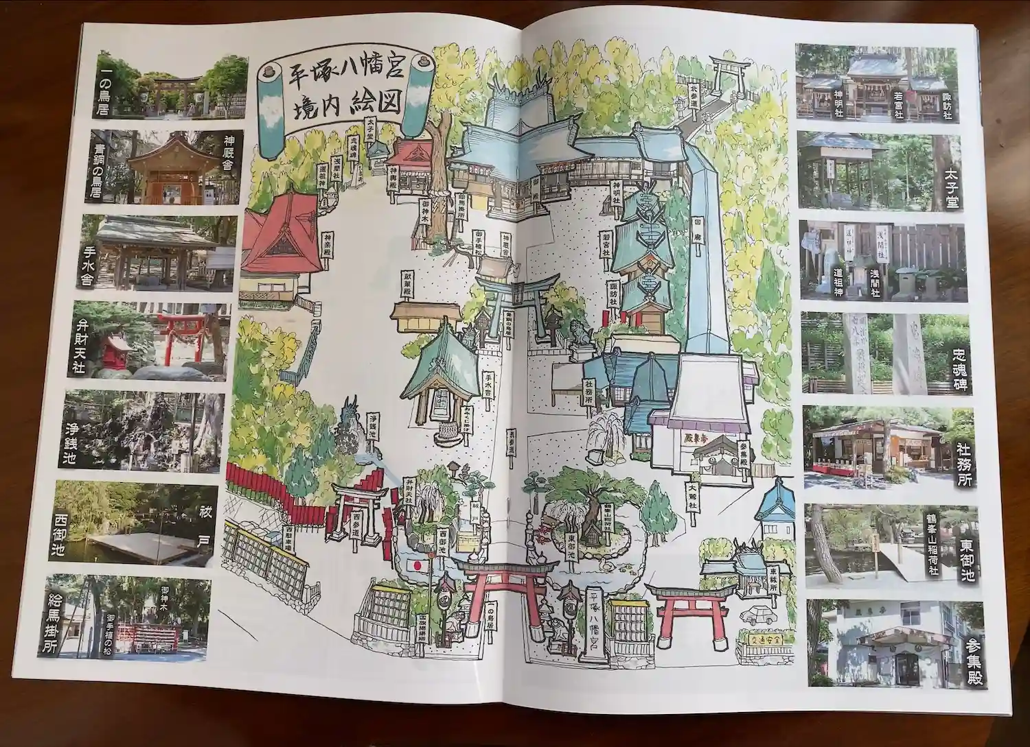 スタンプラリーのおかげで2周目の境内散策を完了。スタンプラリーが終わると、<結願印>(台紙右上の丸印)を押してもらえる上、賞品(神馬・皐月号の絵葉書)がもらえる。写真右は超大判の由緒書。広告入りで雑誌みたい。
