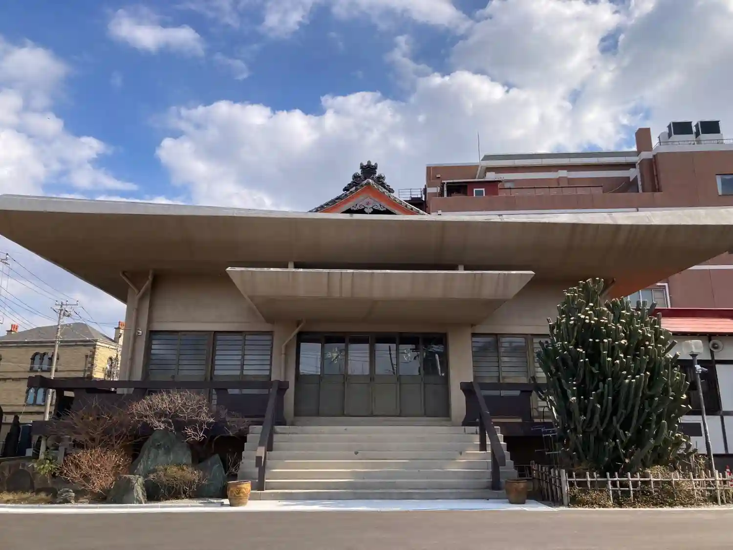 寺務所方向(赤い屋根)、右手は護摩堂(現在は使用されていないようです)。