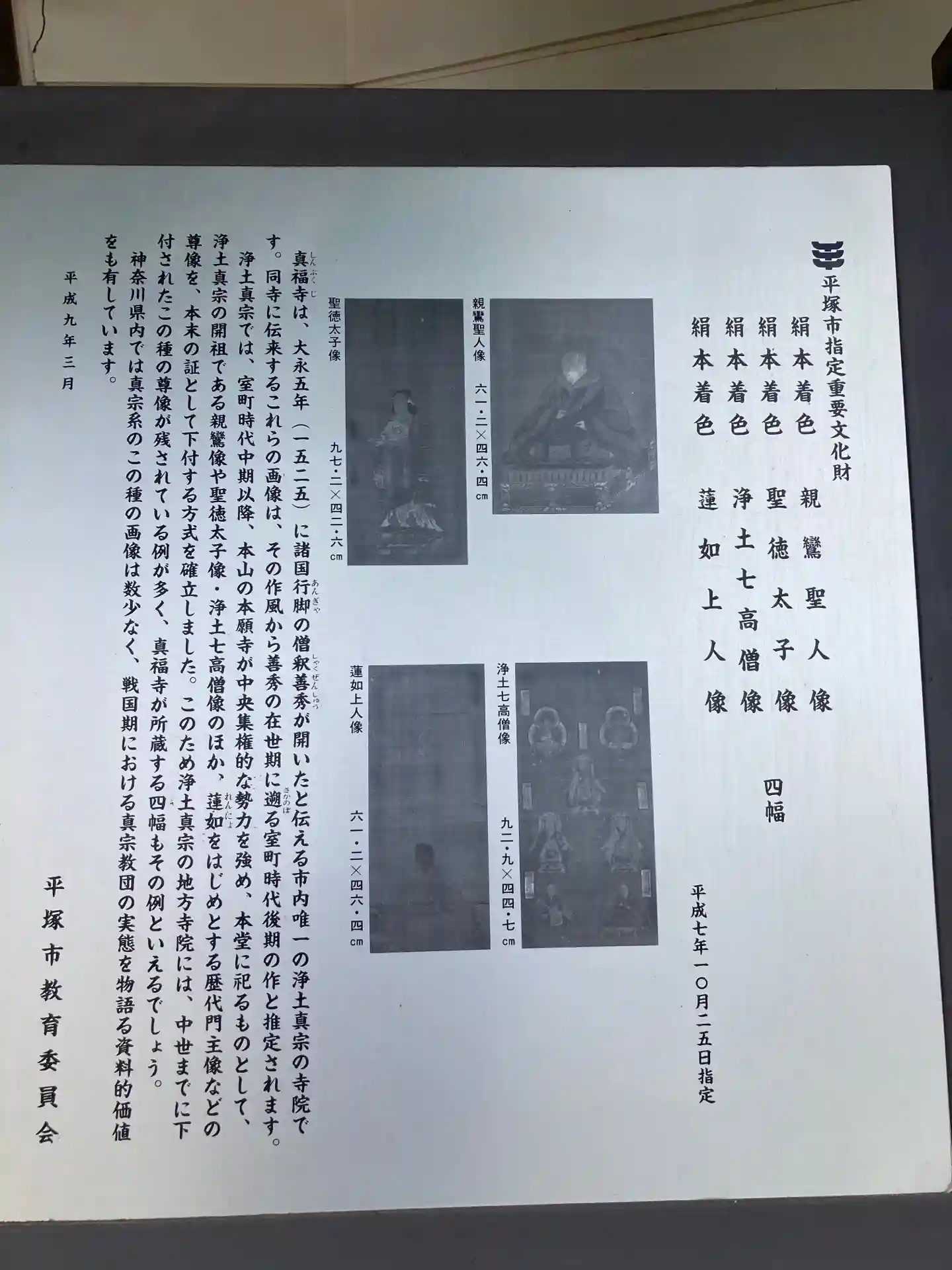 関東大震災で本堂が全壊、昭和3年に再建、現本堂は平成12年に落成した。本堂内陣のご絵像は、平成7年に市の文化財に指定されている。