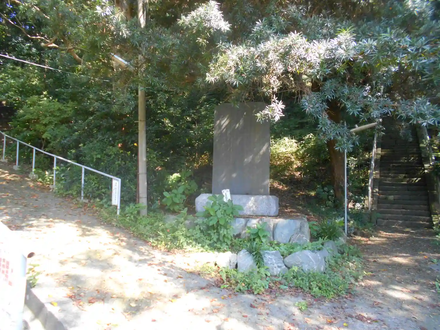 03-1) 石碑を挟んで、左:スロープ状の脇参道 と 右:参道階段。
