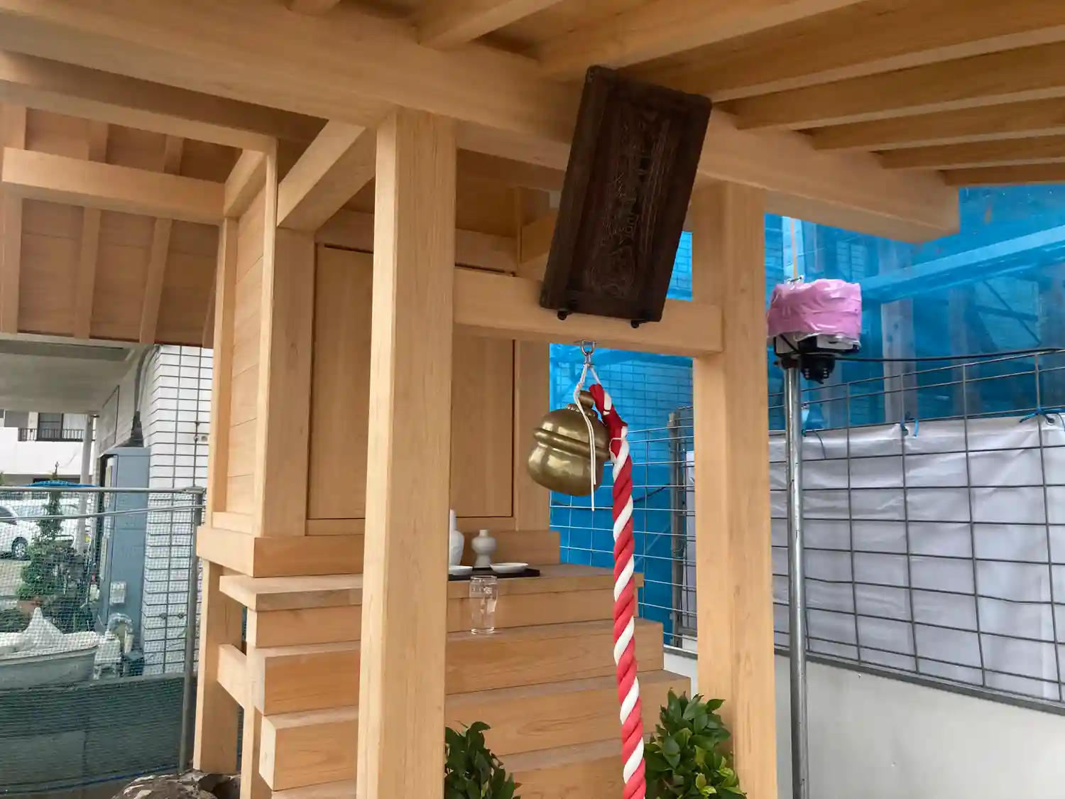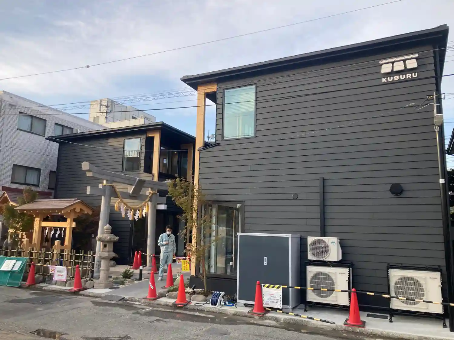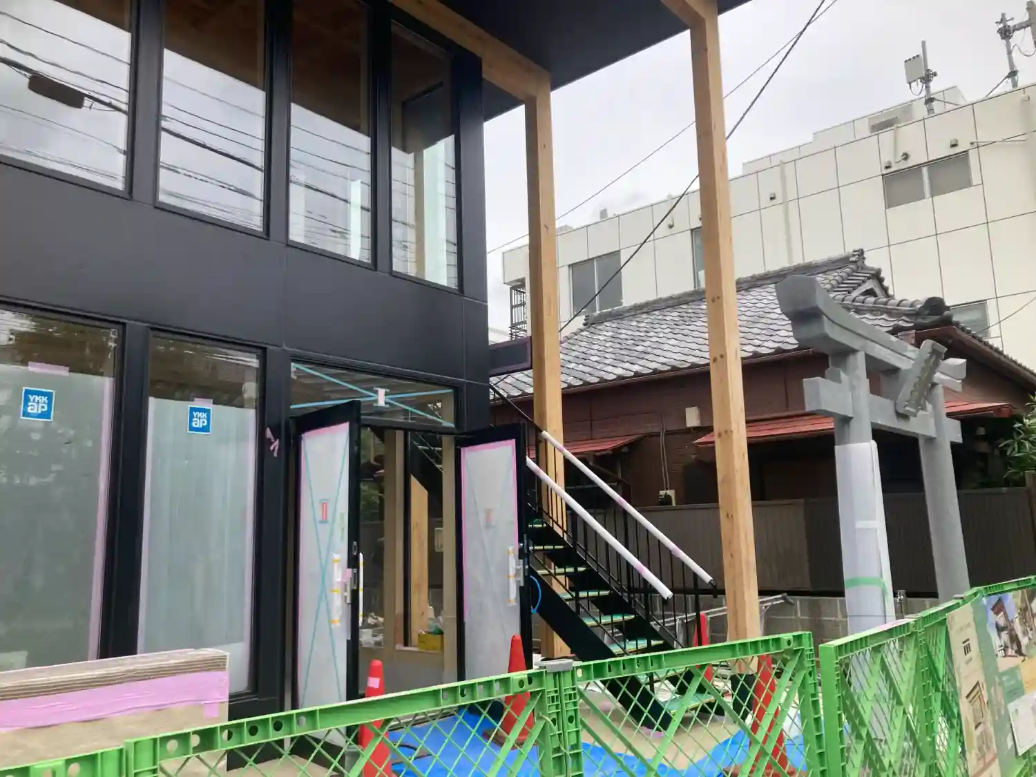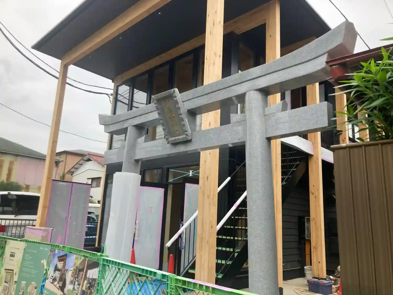 建物の外観工事が終了し、鳥居等の設置工事中でした。