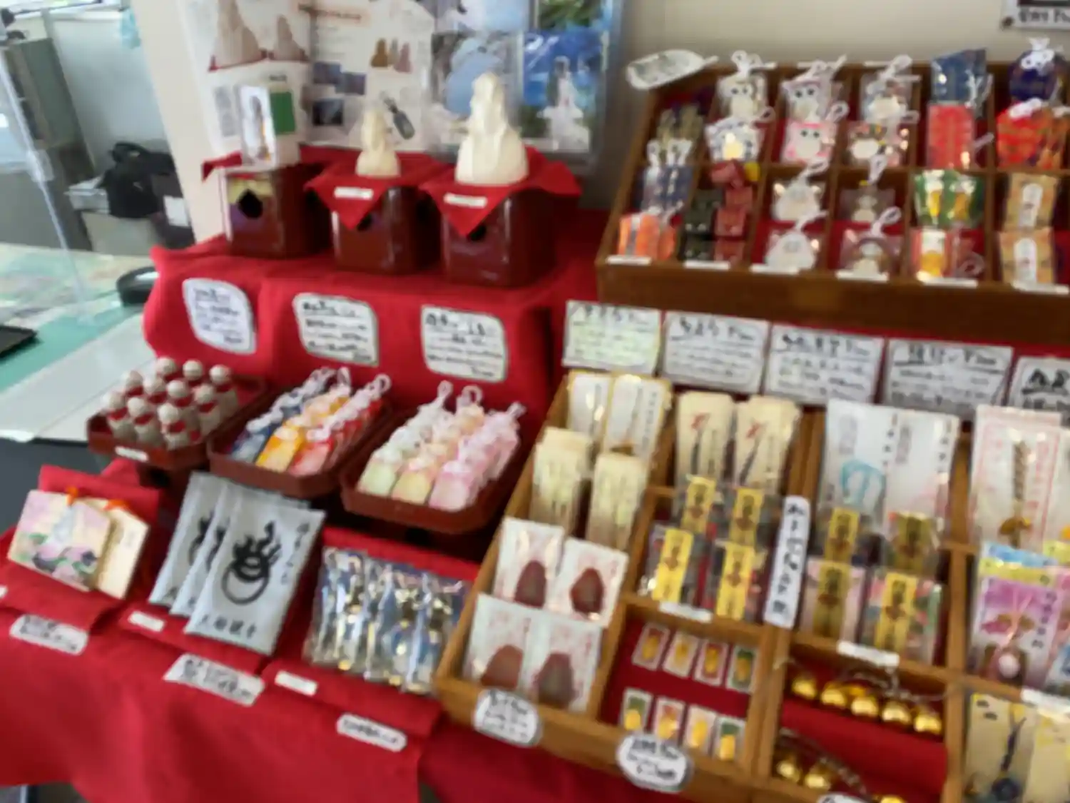 ポストカードやお地蔵様のキーホルダー等もありました。右側にはショーケースがあって木彫りの観音様等が販売されています。