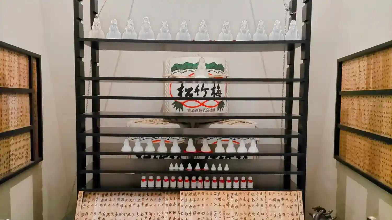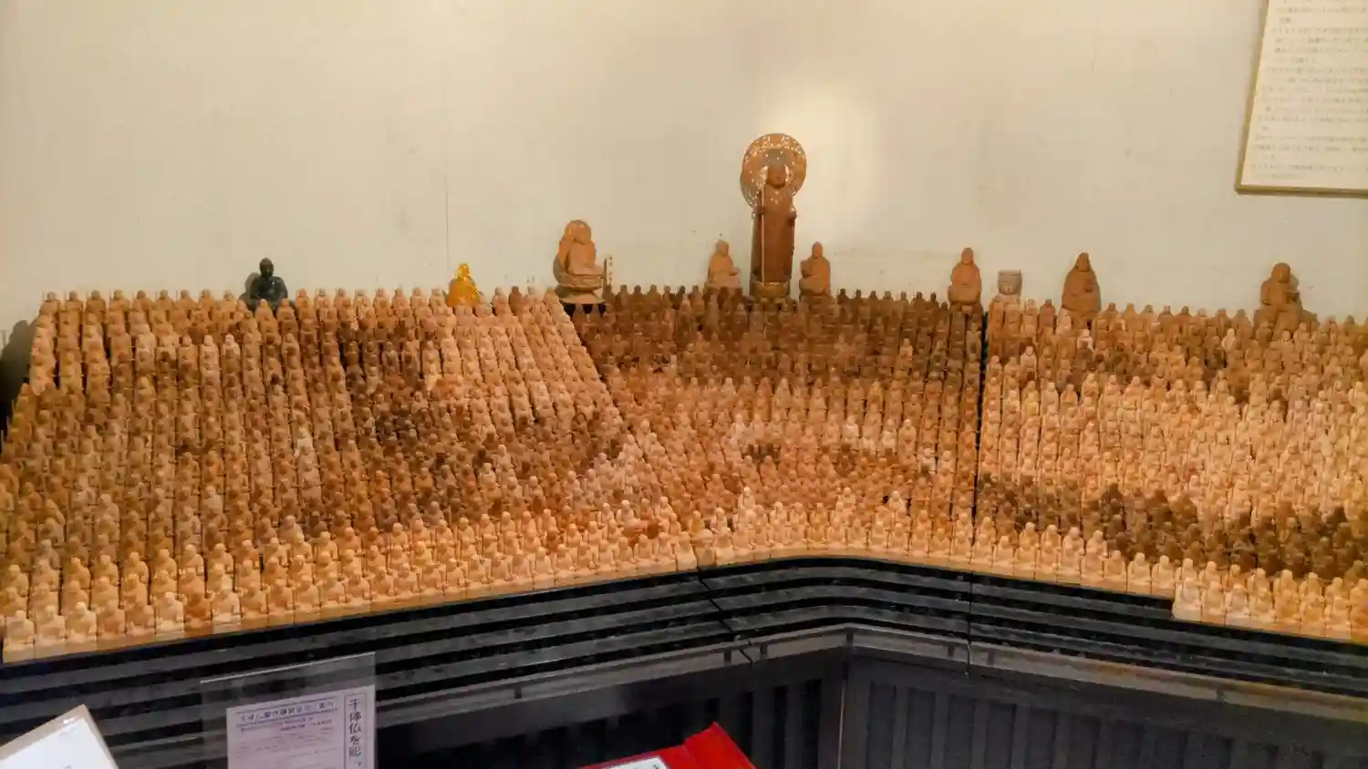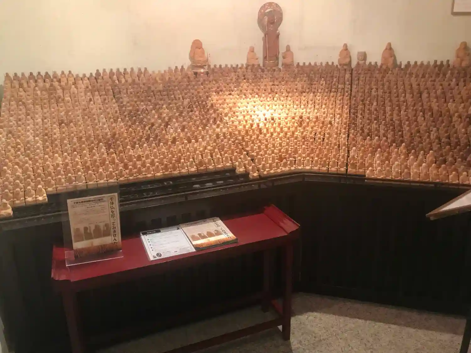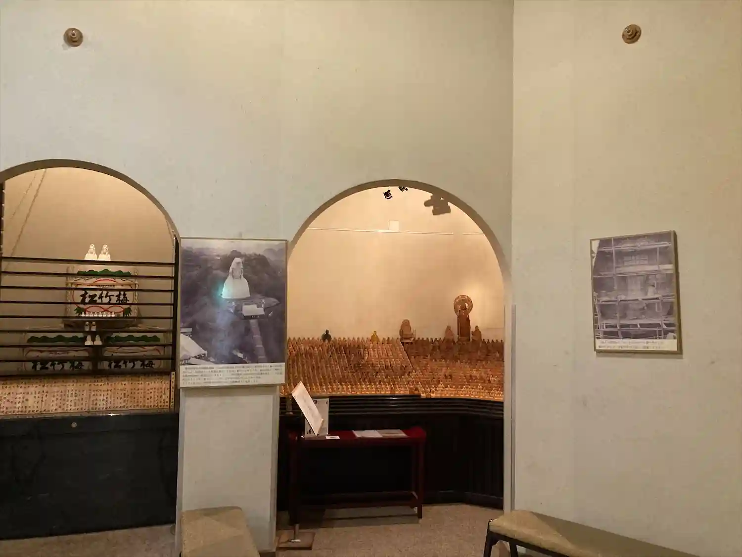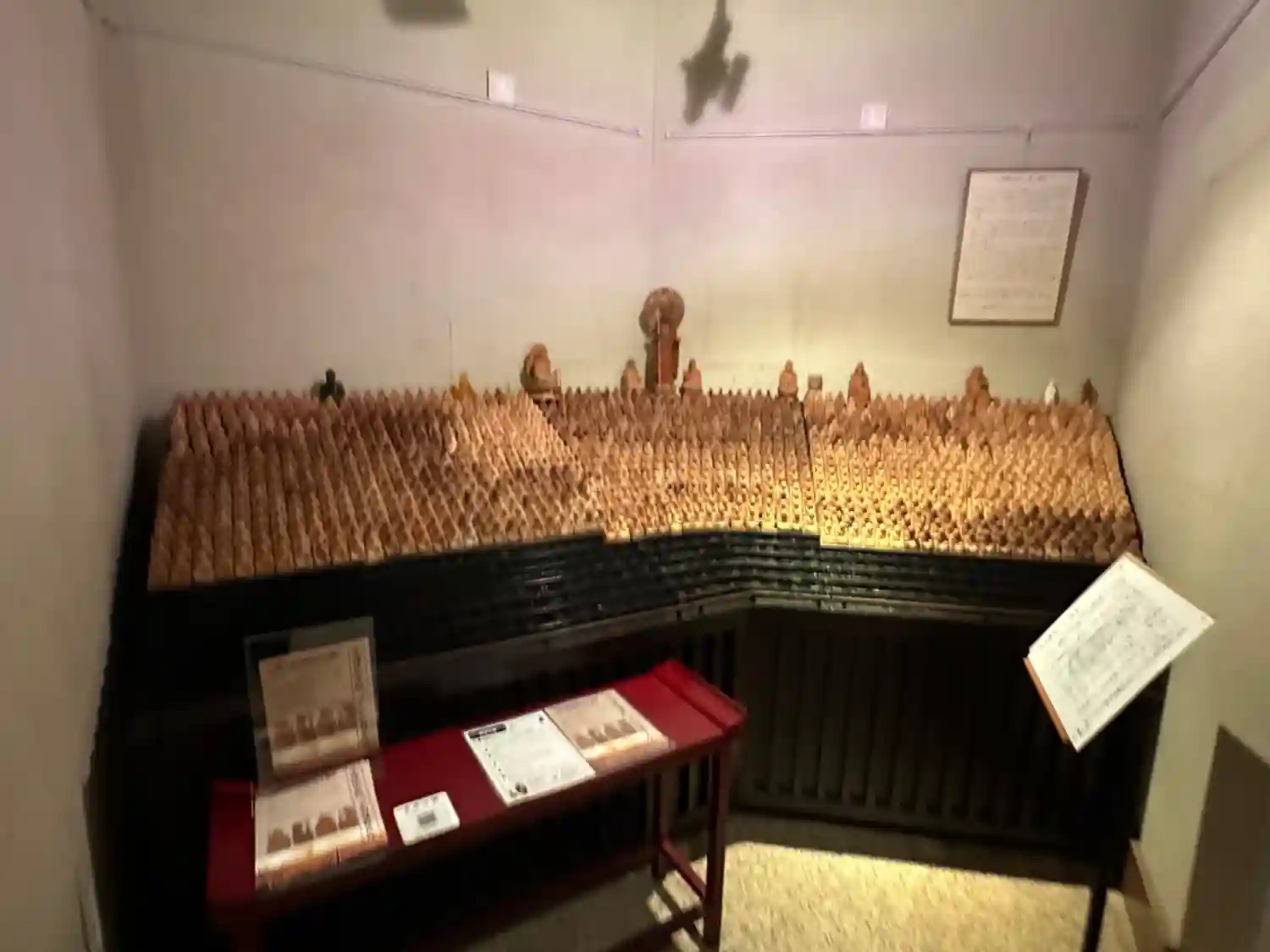 ポストカードやお地蔵様のキーホルダー等もありました。右側にはショーケースがあって木彫りの観音様等が販売されています。