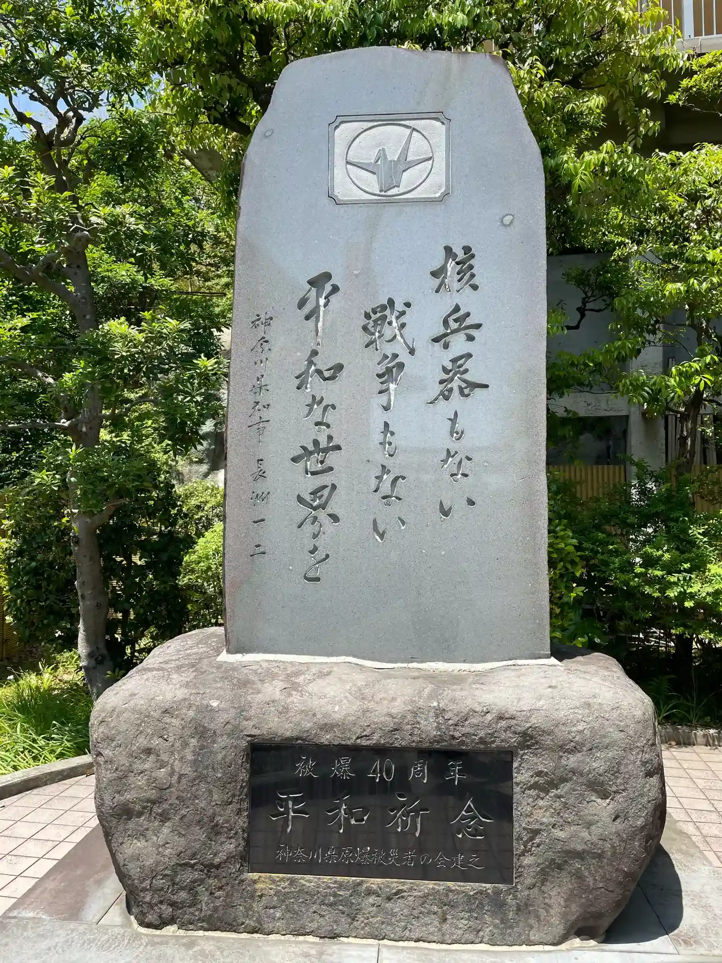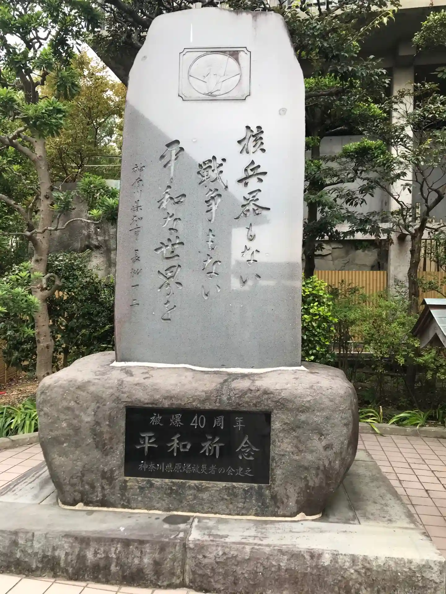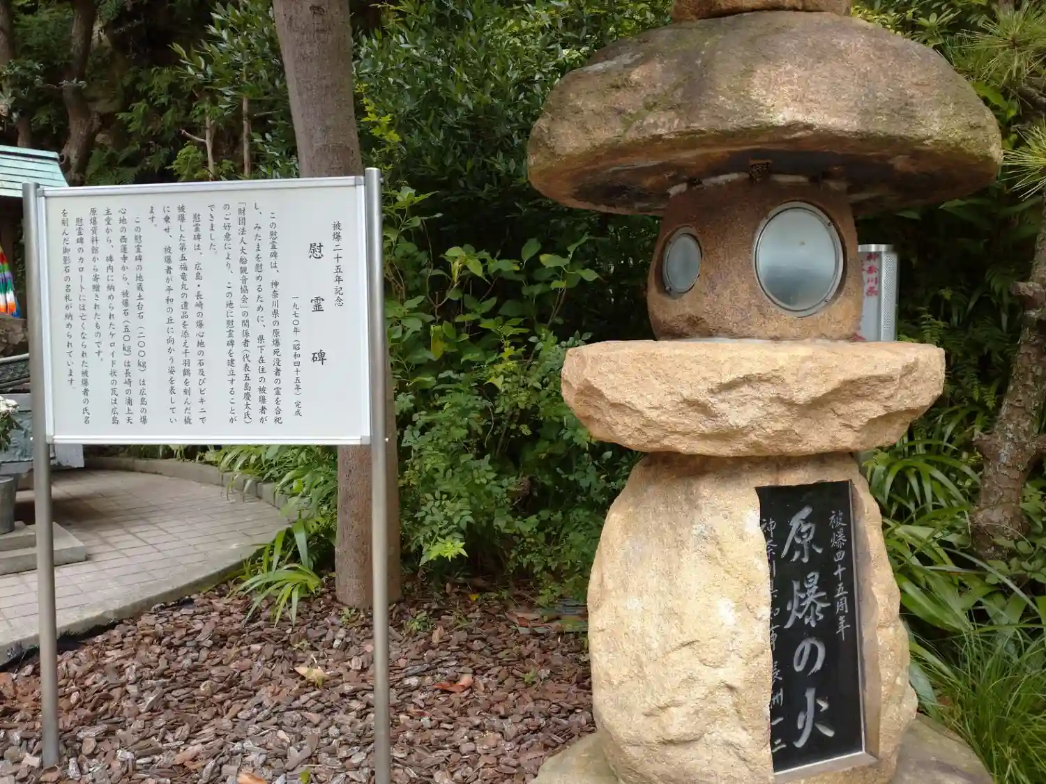 慰霊碑の地蔵土台石は、広島の爆心地の西蓮寺から、被爆石は長崎の浦上天主堂から、碑内に納められたケロイド状の瓦は広島原爆資料館から寄贈されたものです。