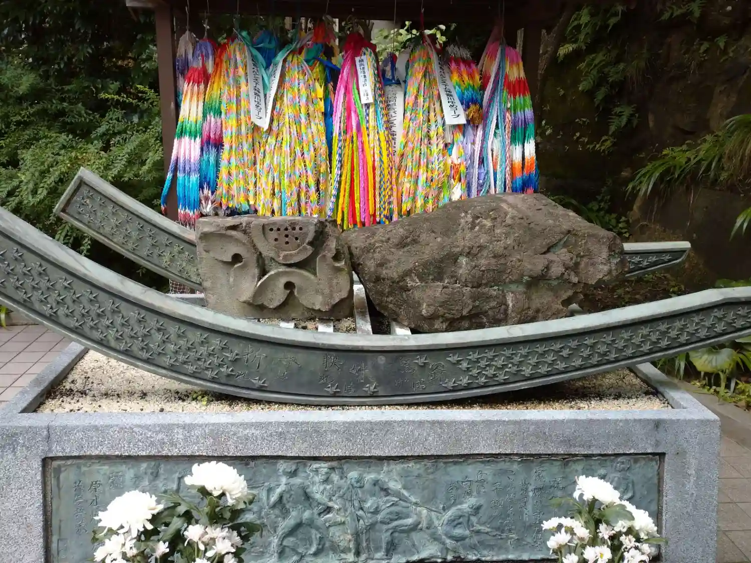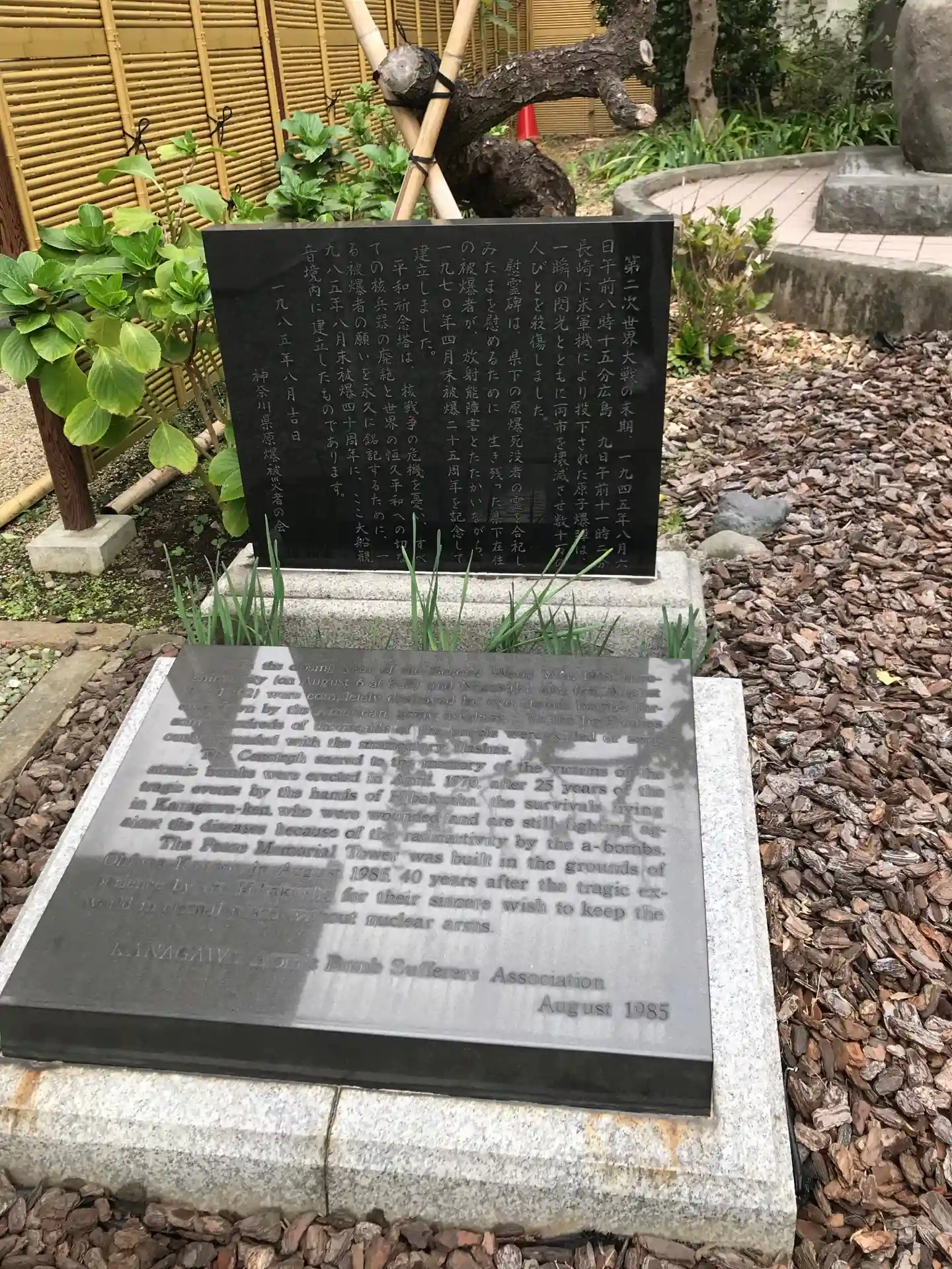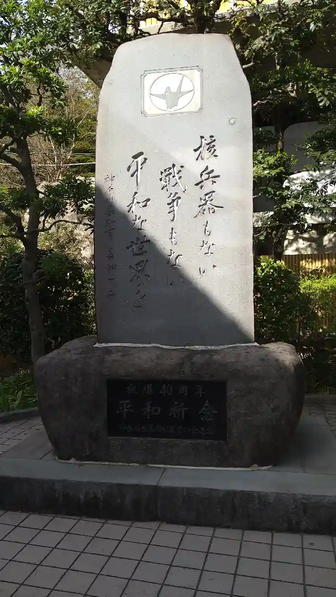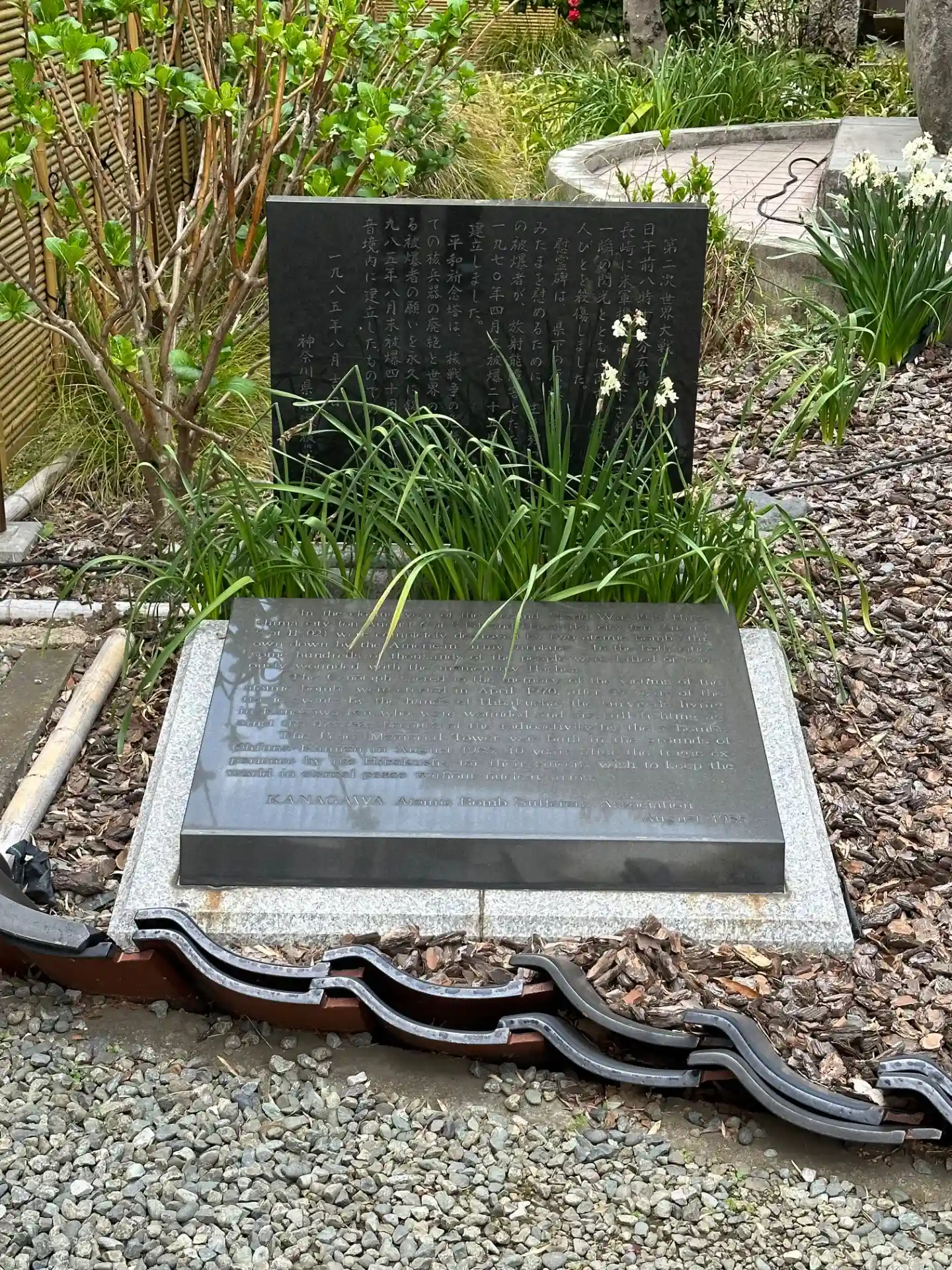 慰霊碑の地蔵土台石は、広島の爆心地の西蓮寺から、被爆石は長崎の浦上天主堂から、碑内に納められたケロイド状の瓦は広島原爆資料館から寄贈されたものです。