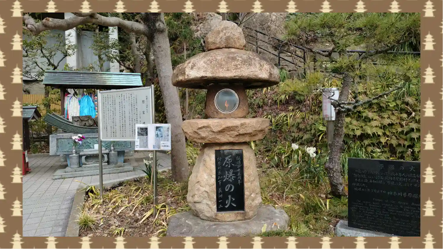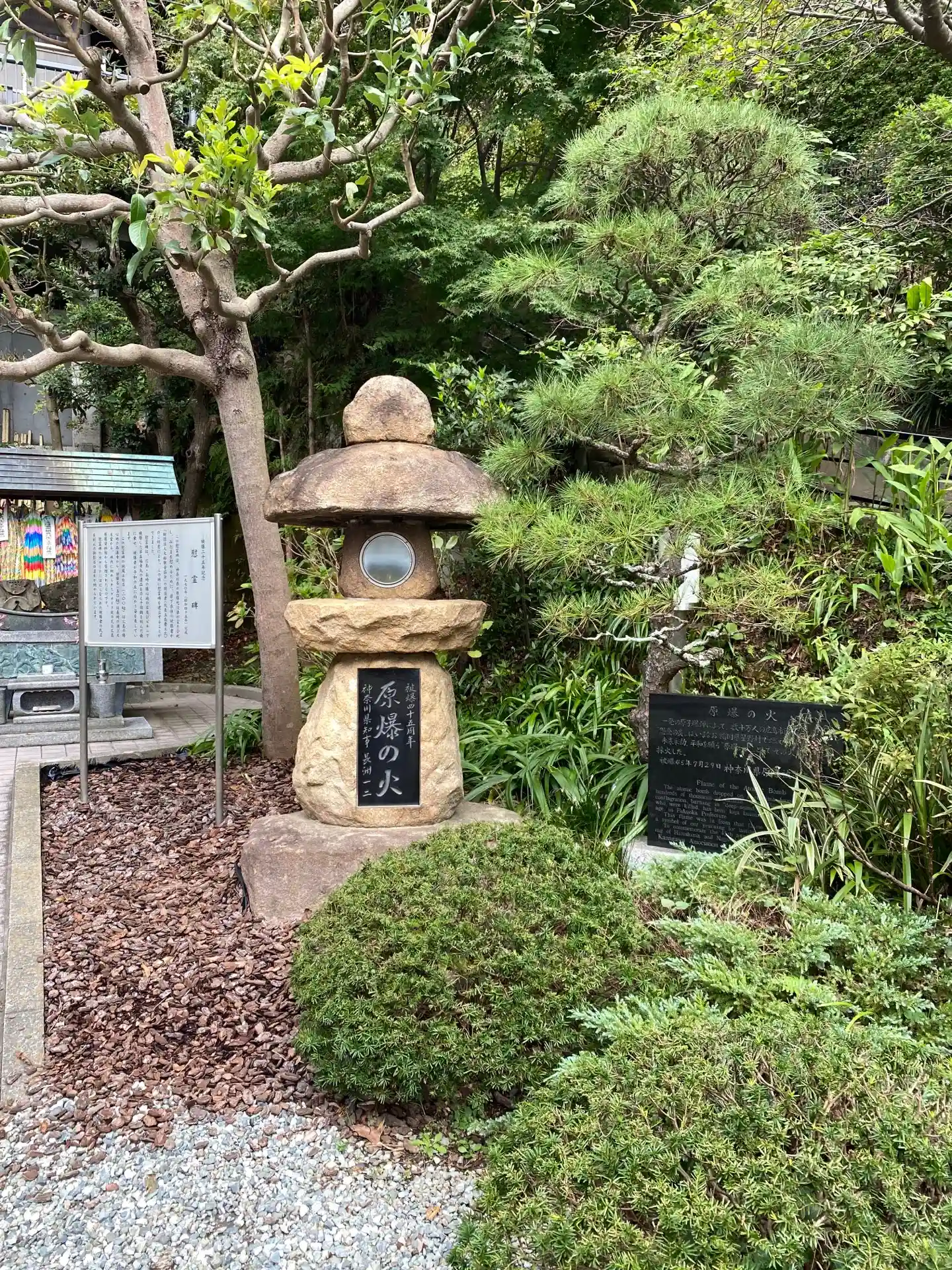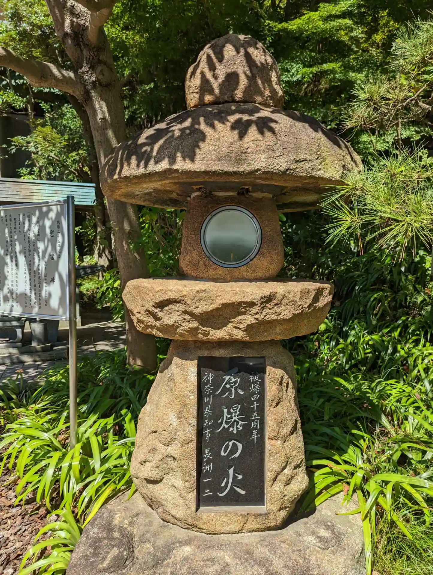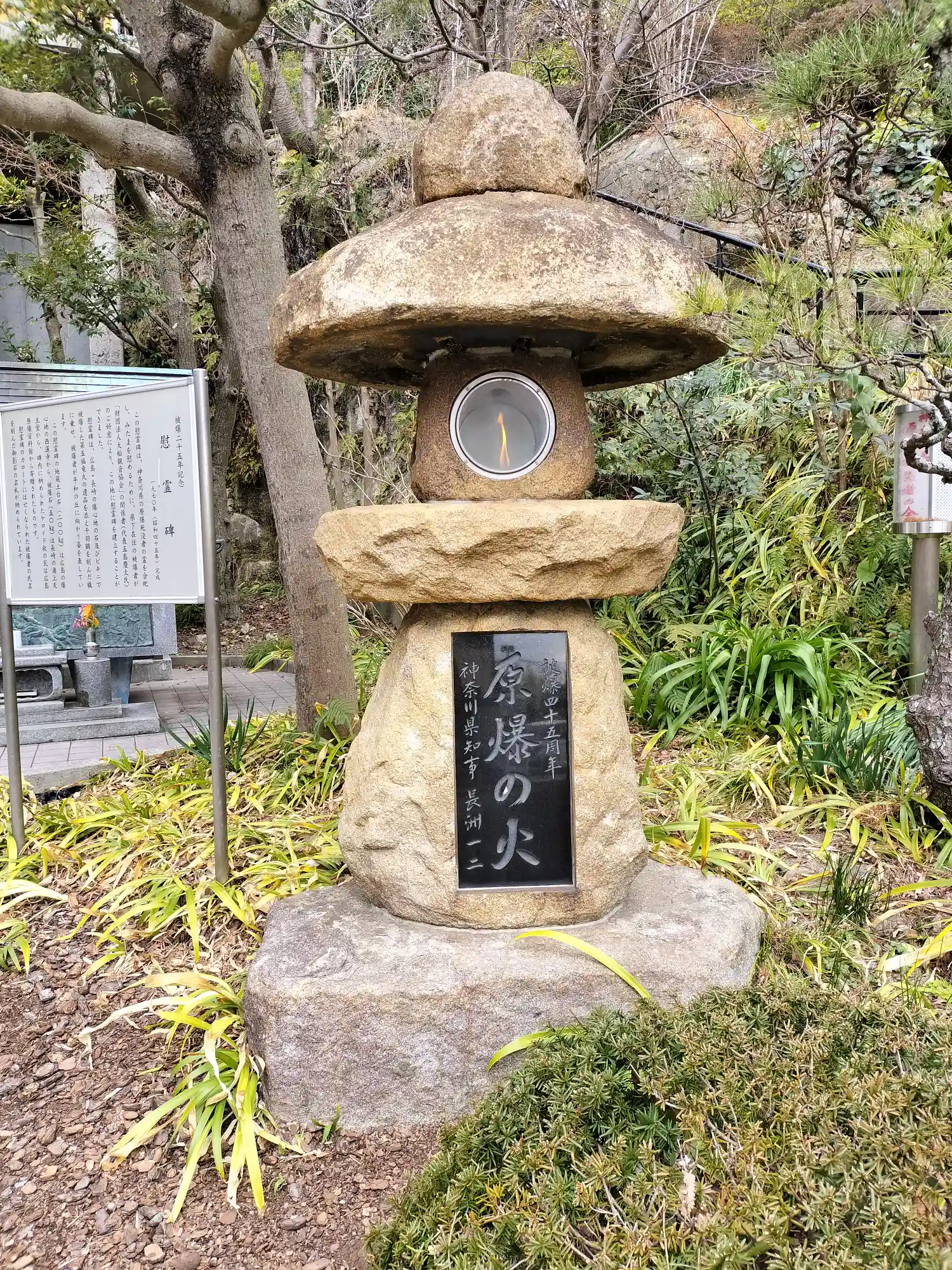 右の灯篭の火は、広島原爆の火です。福岡県星野村で灯し続けていたものを、分火されていただいたそうです。