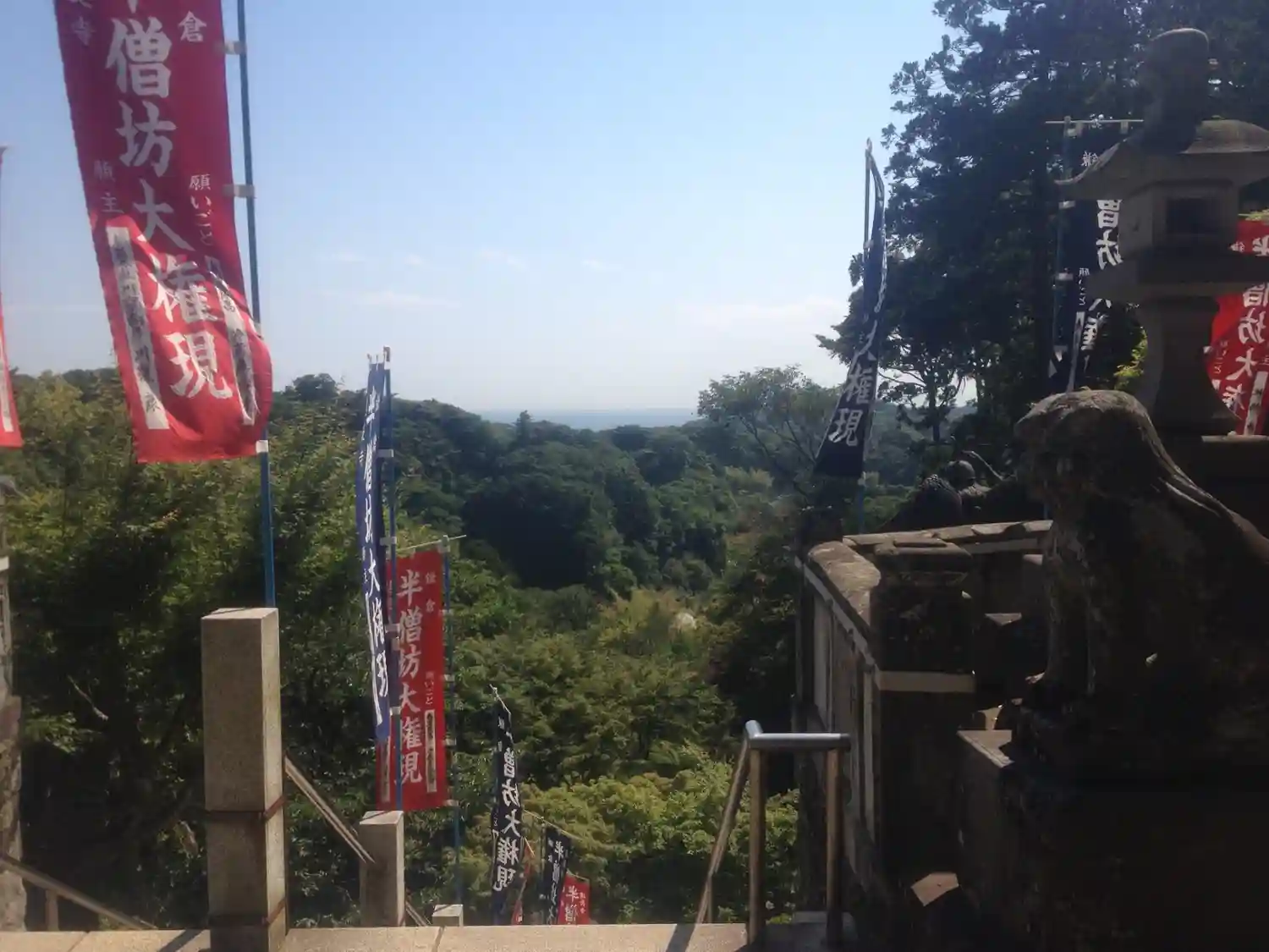 狛犬さんがおられるので、登った先のお堂の前からの景色だと思います。
