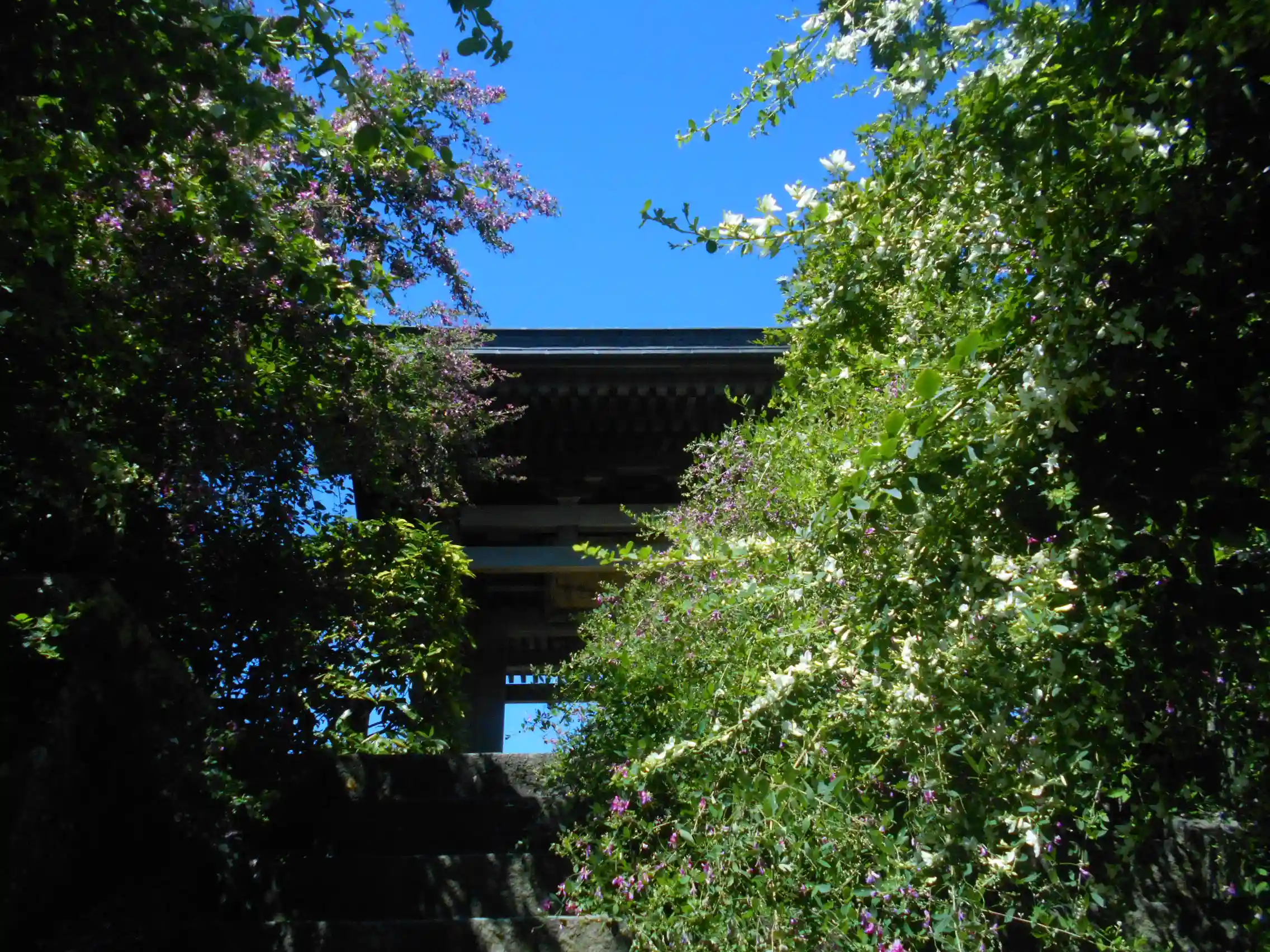 02-1) 山門を潜って右方の、芙蓉の花を鐘楼方向に。