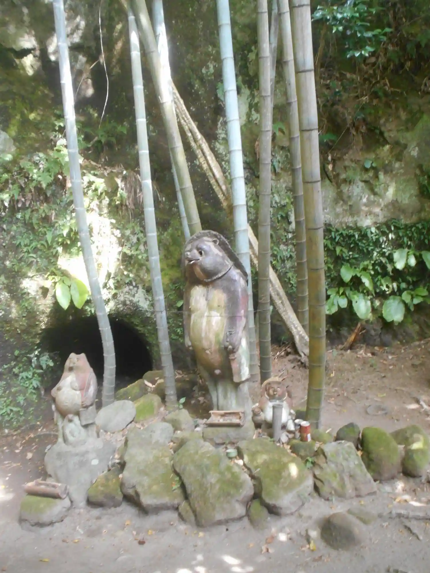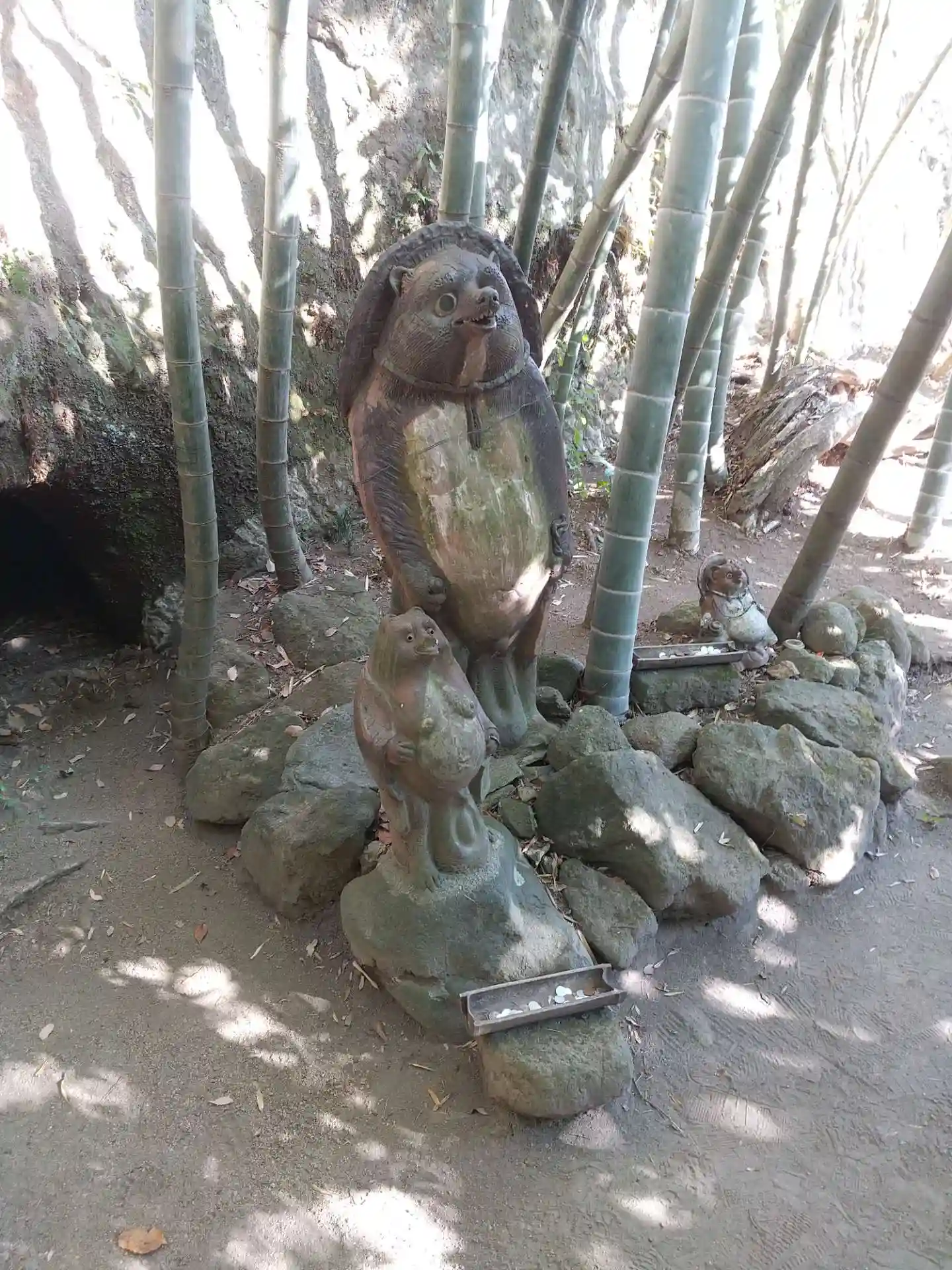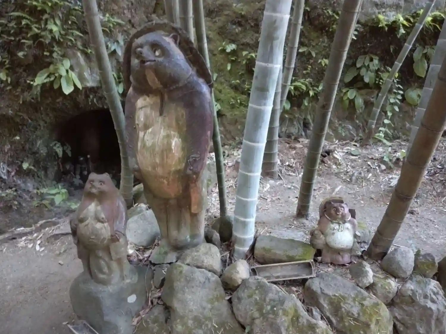 竹林にタヌキの木彫り