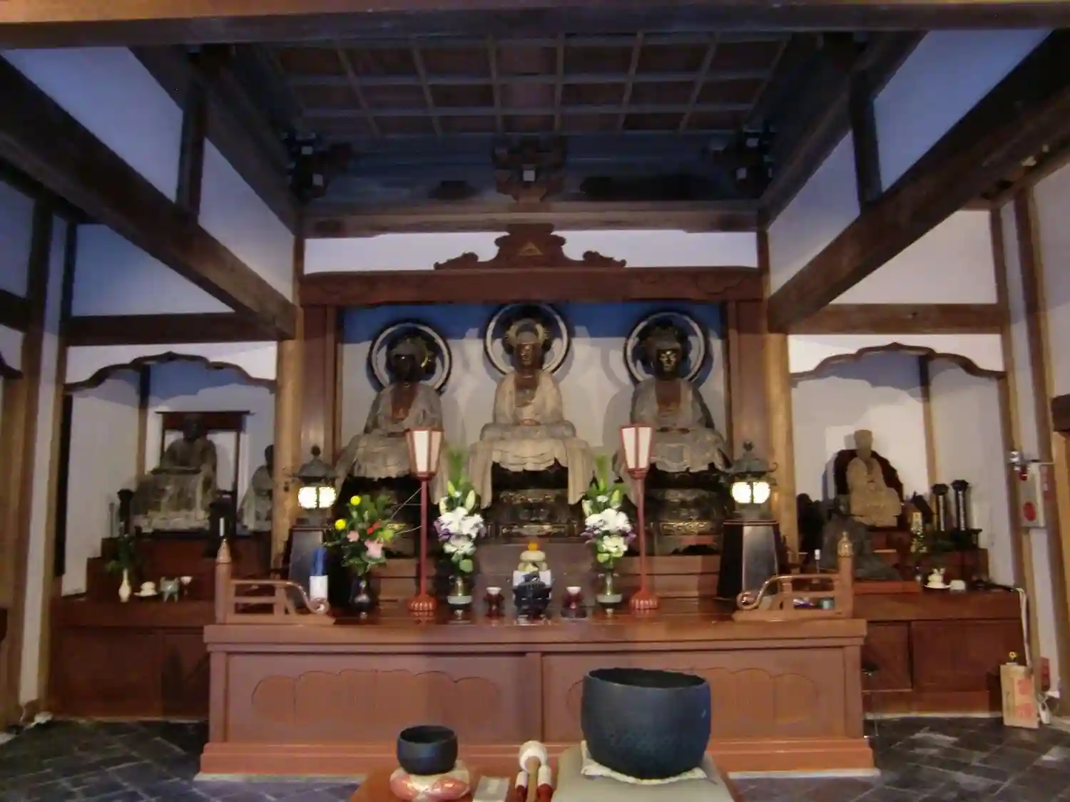 浄智寺本堂「曇崋殿」には三体の如来様が祀られており、左から阿弥陀如来、釈迦如来、弥勒如来。「過去・現在・未来」の時を象徴しているとのこと。
