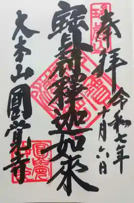 真ん中に寶冠釋迦如来と書かれ、右上に東国花の寺百ヶ寺の印、花の形をした東国花の寺20周年の印、真ん中に三宝印、左上に瑞鹿山の印、左に大本山円覚寺の文字、左下に圓覚寺印が押されています。