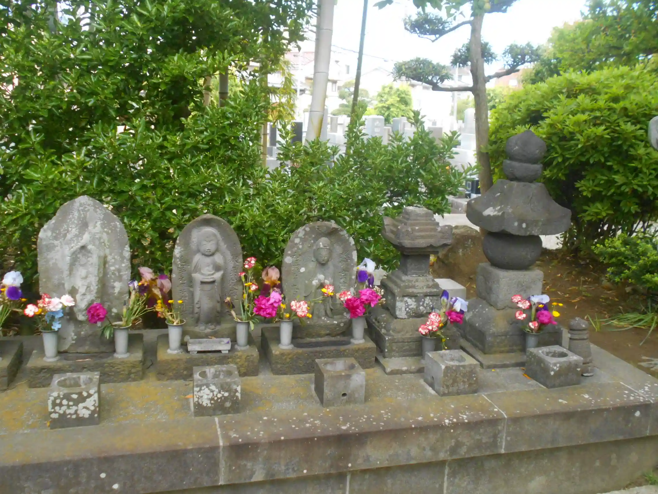01-1) 山門を潜って、向かって参道左方の、石仏と石塔。