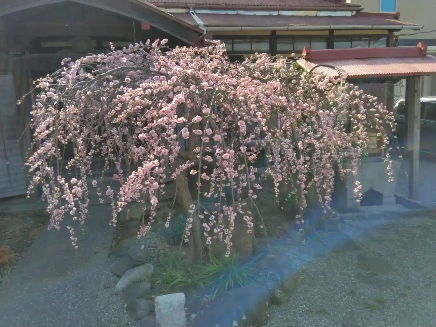 本堂前には紅白のしだれ梅が咲いていました。