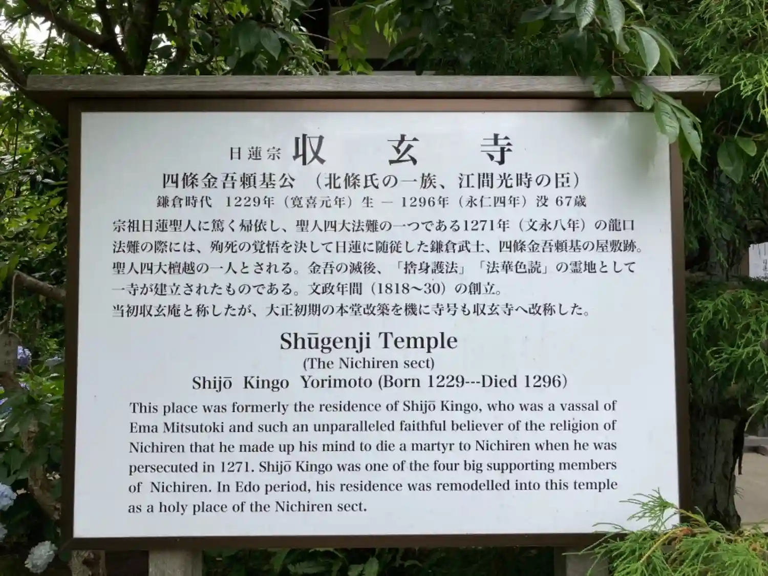 鎌倉武士であった四条金吾の屋敷跡に建てられた日蓮宗の寺院。四条金吾は北条義時の孫である江間光時に仕…