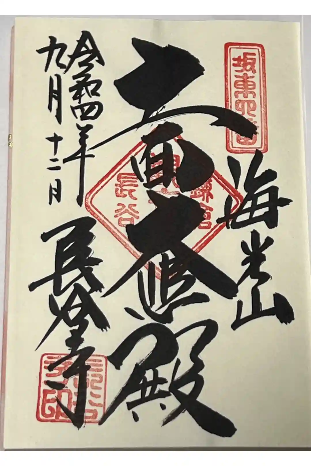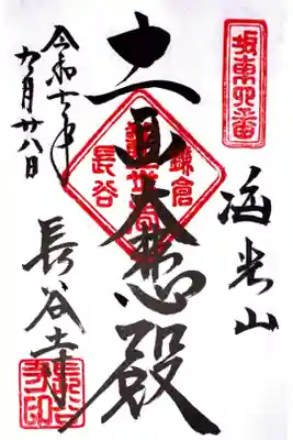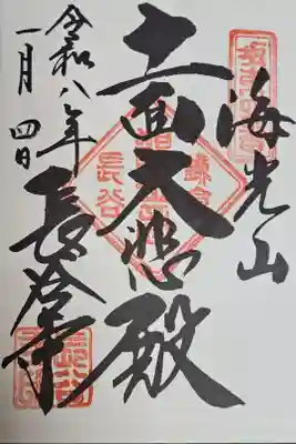 右に海光山、真ん中に十一面大悲殿、左に長谷寺と書かれ、右上に坂東四番、真ん中に鎌倉観世音長谷、左下に社印が押されています。