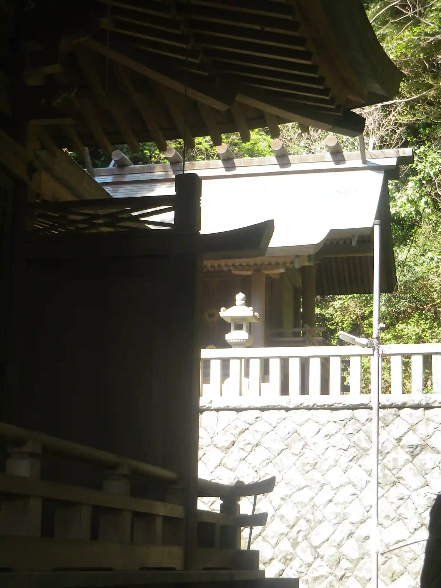 18) 向かって拝殿左奥から、本殿を遥拝。 撮影立ち位置に規制ロープ。
