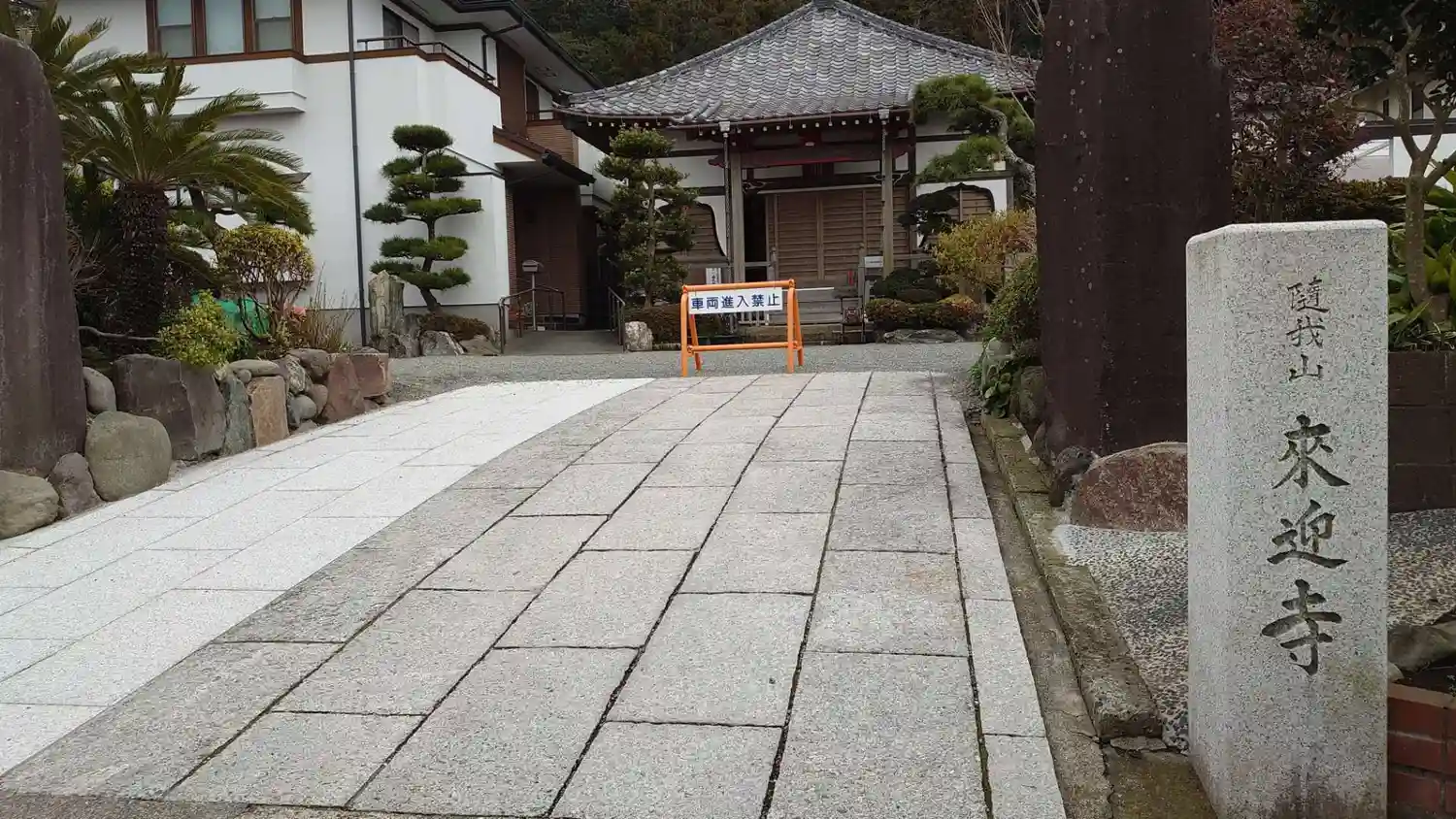 01) 道路沿いの、寺号標 ” 鎌倉十四番 子育観音 時宗 来迎寺 ” と