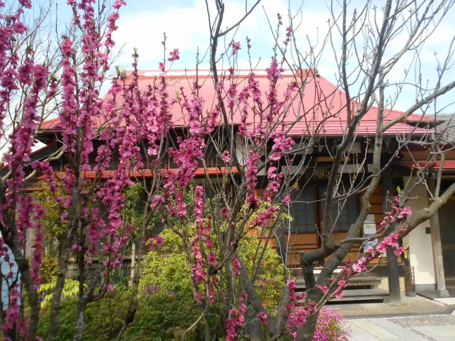 03-1) 向かって境内右方、背の高い緋桃の花が満開