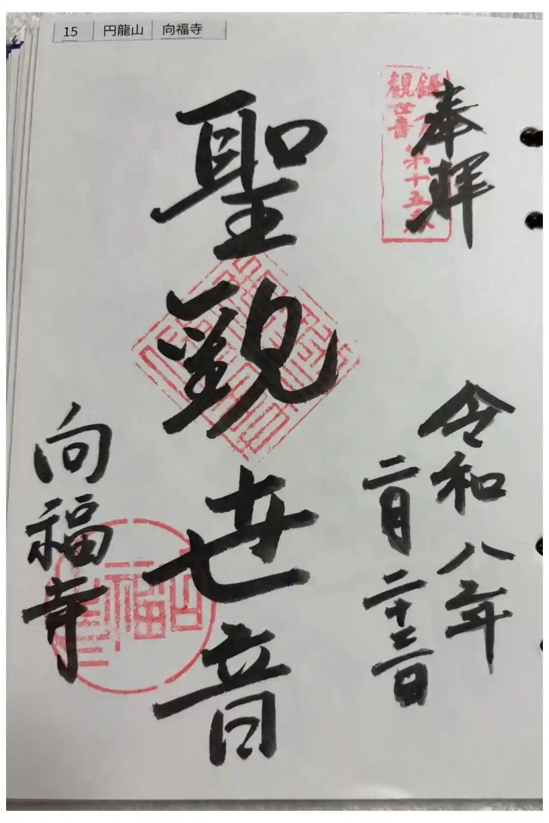 鎌倉三十三観音15番札所、向福寺さんの聖観音の御朱印です。