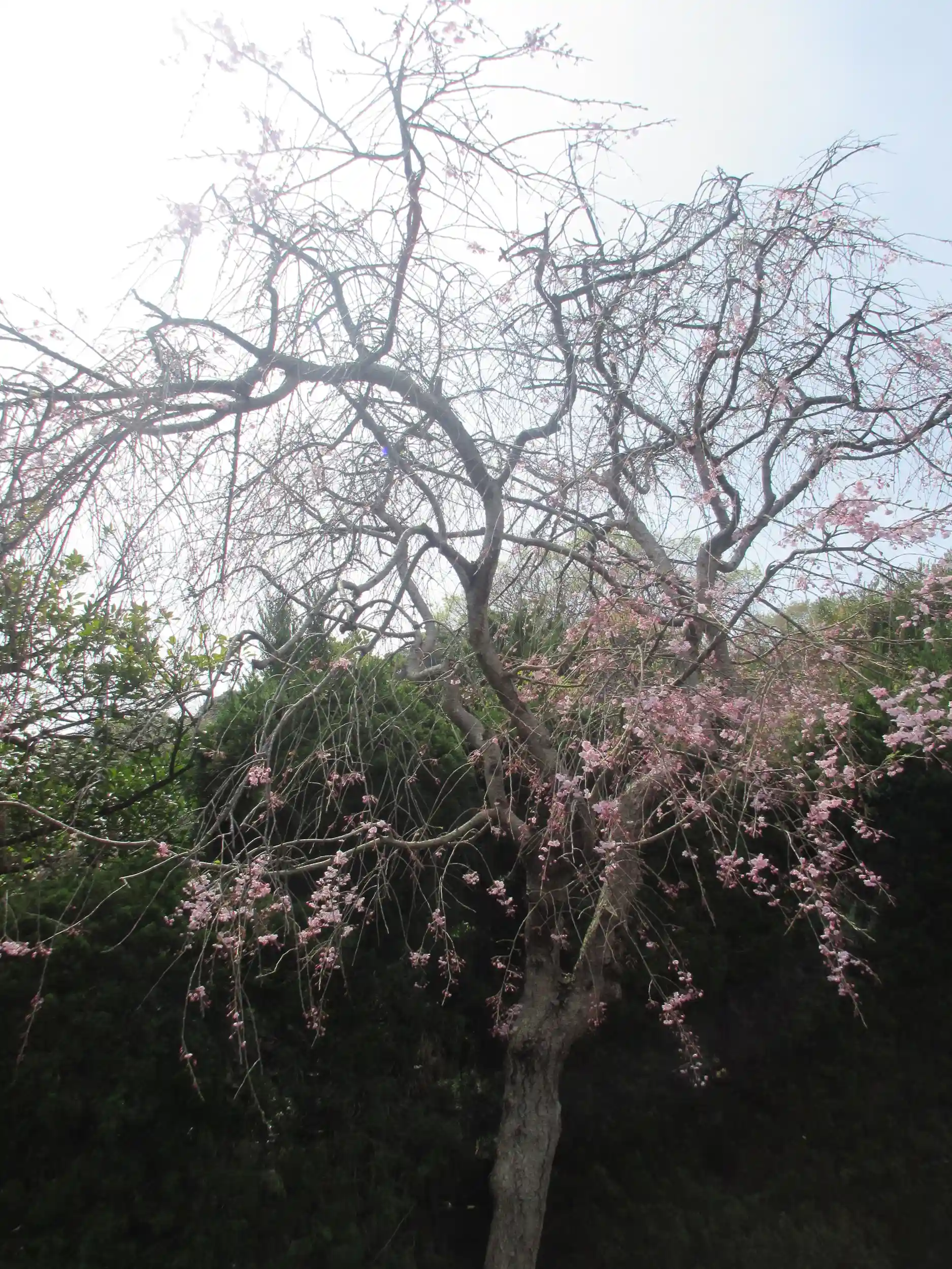 連日の強風雨に耐え開花を維持している枝垂れ桜。