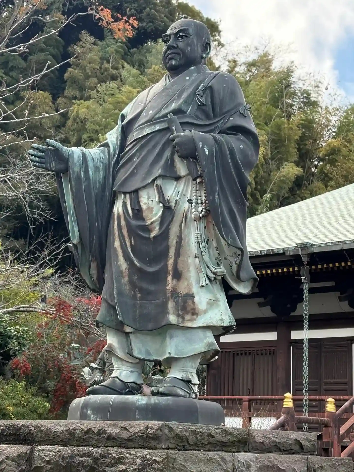 本堂前の日蓮聖人立像(高村光雲作)と四天王立像も迫力があります。