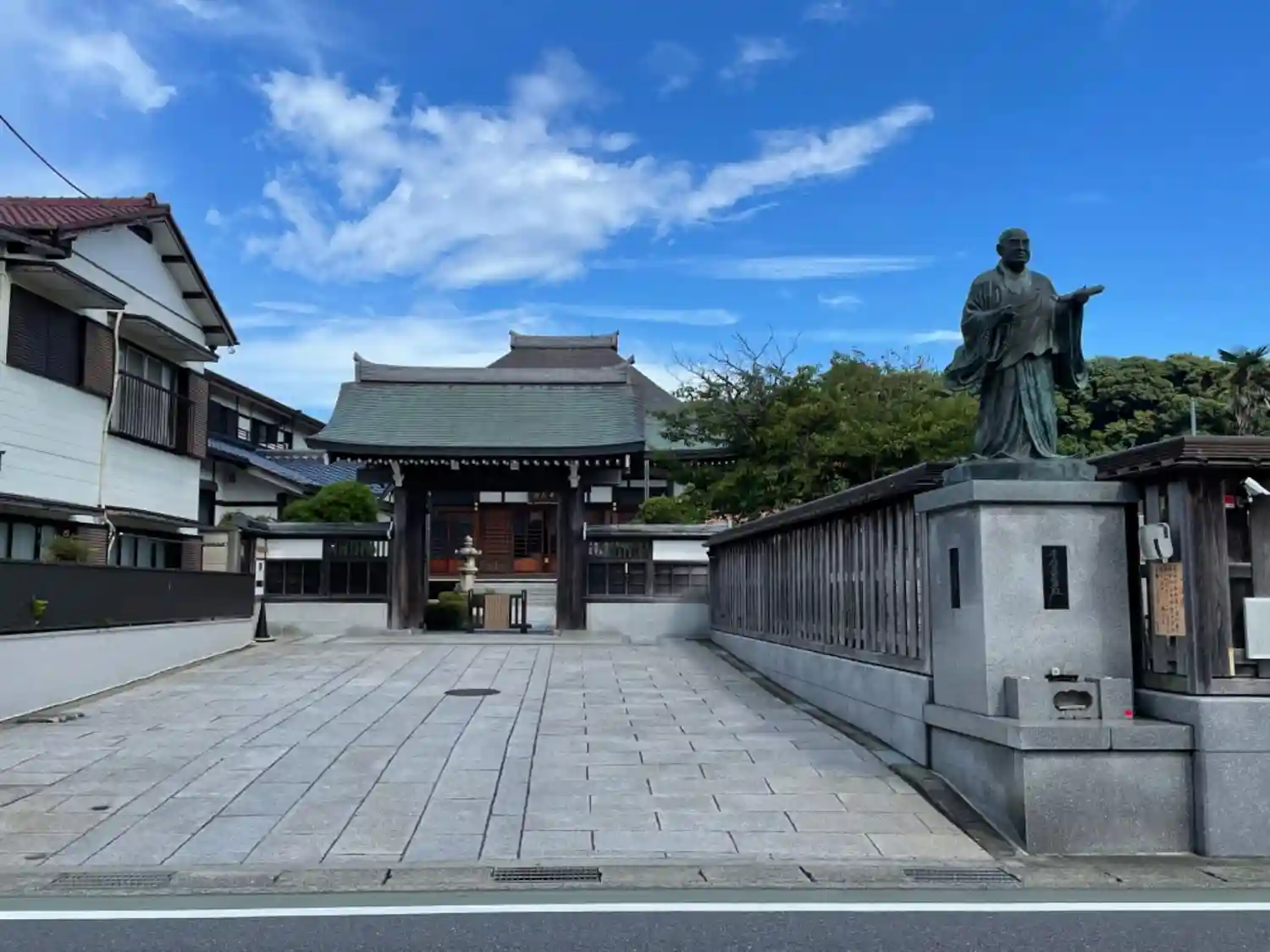 大通りに日蓮さんの銅像が立っています