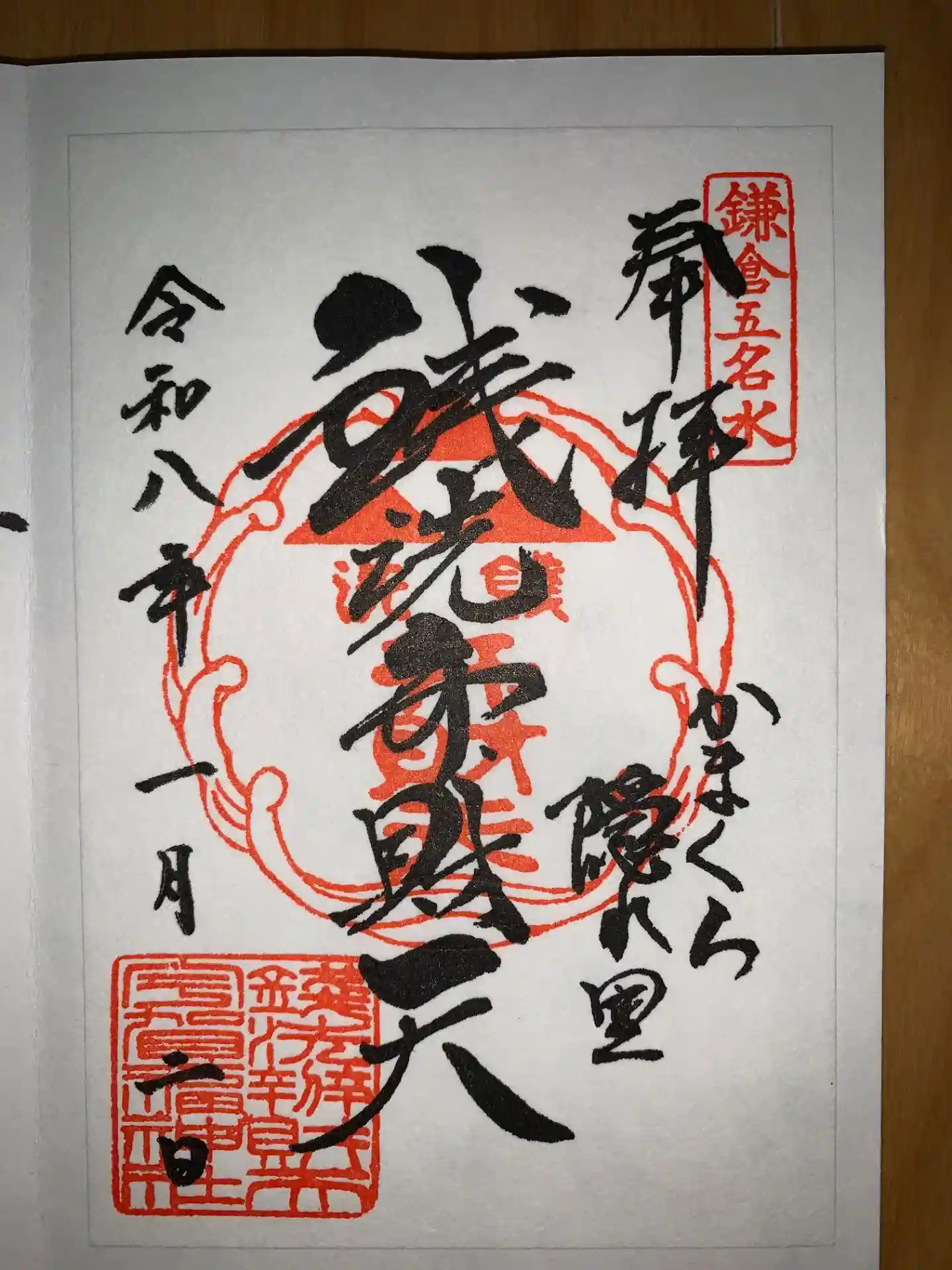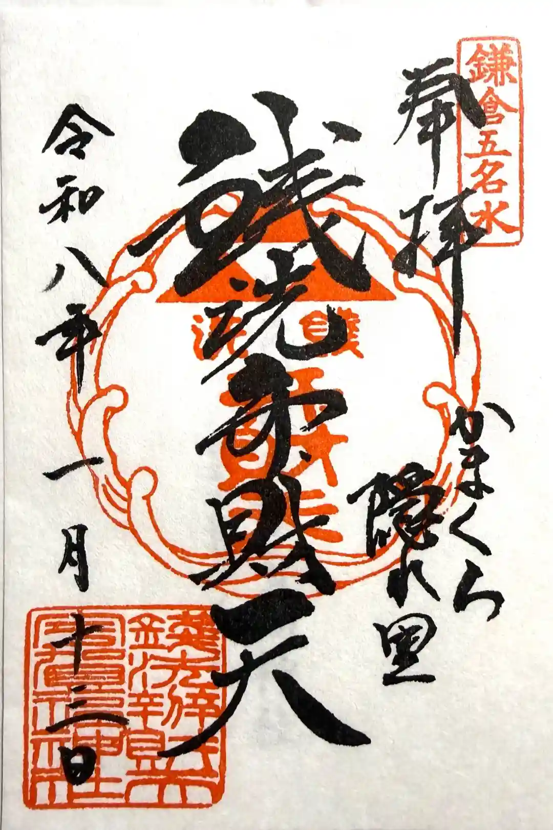| 御朱印 | あり 真ん中に銭洗弁財天、右下にかまくら隠れ里と書かれ、右上に鎌倉五名水の印、真ん中に銭洗弁財天の印、左下に社印が押されています。