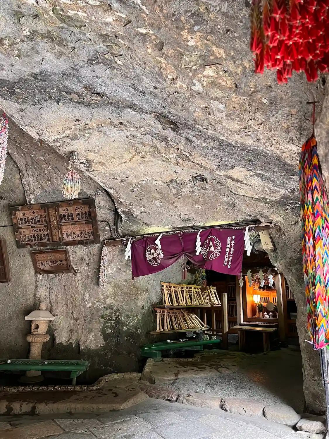 鳥居を抜け岩を繰り抜いたトンネルを抜けて洞窟の中で参拝、銭洗いをしてご利益を願います。
