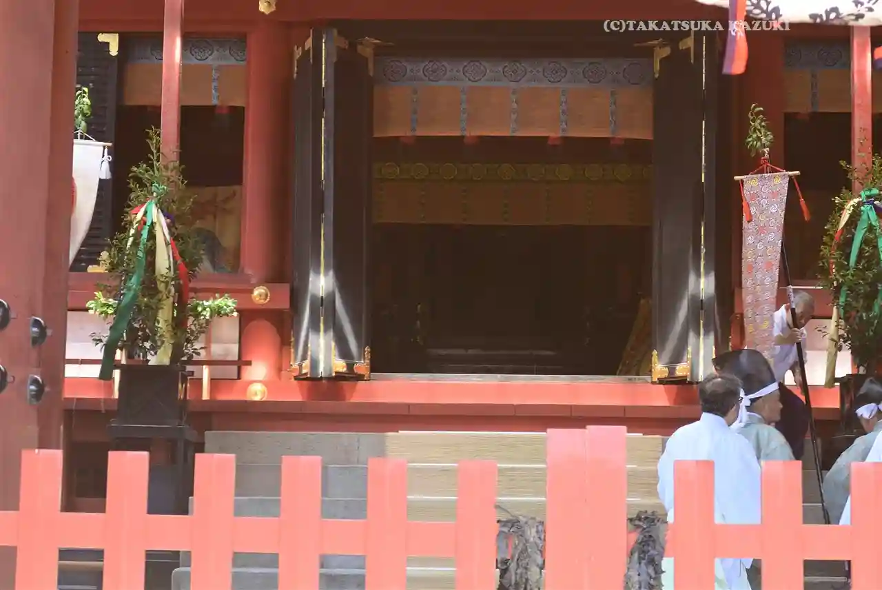 神職様の参進、二の鳥居までの神輿渡御、神事