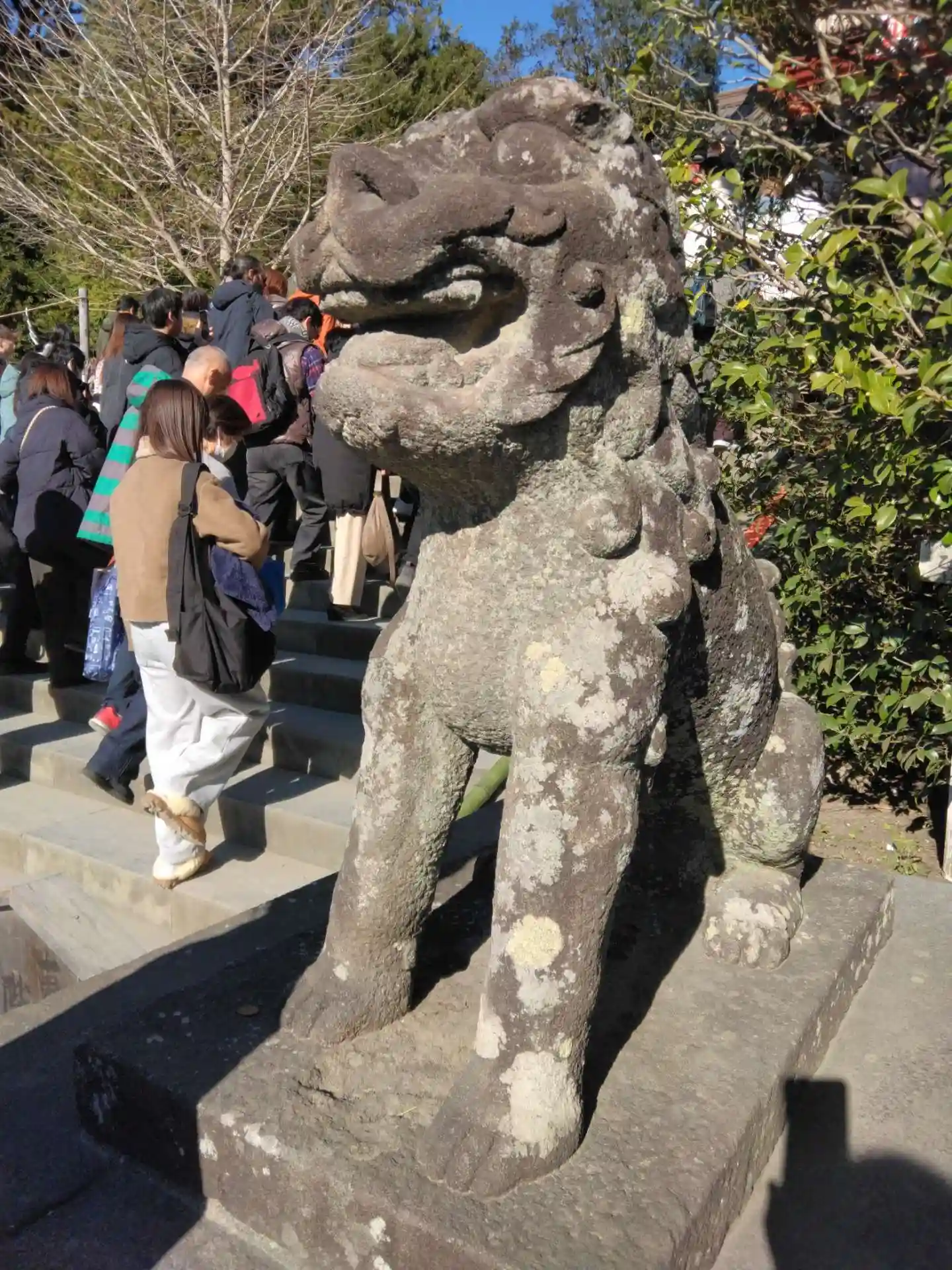 大石段前の「階段落ちの狛犬」。