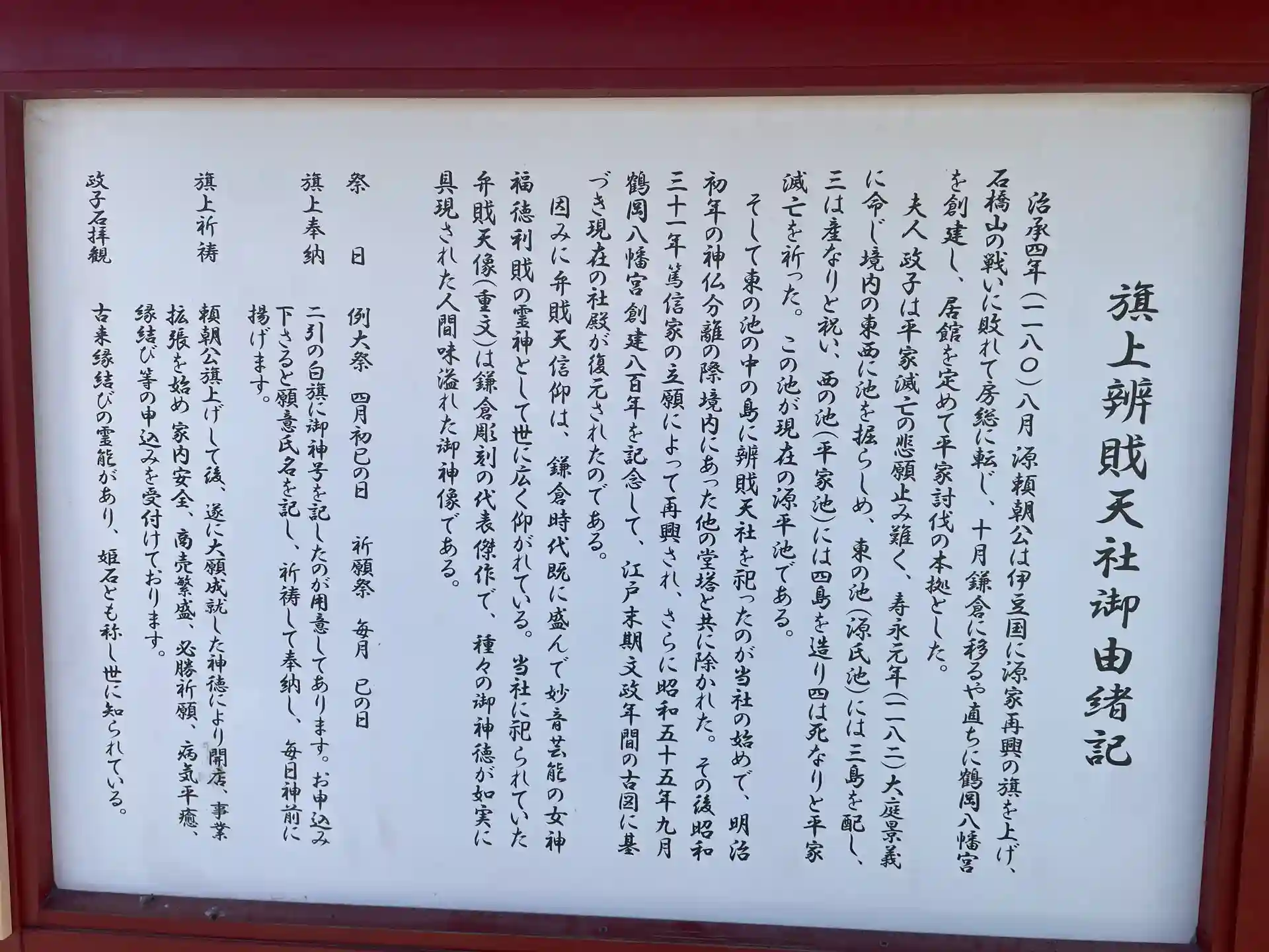 鶴岡八幡宮の敷地内に鎮座します。 お天気も良く、池の辺りにあるのでまったり散策し、お詣りできました。