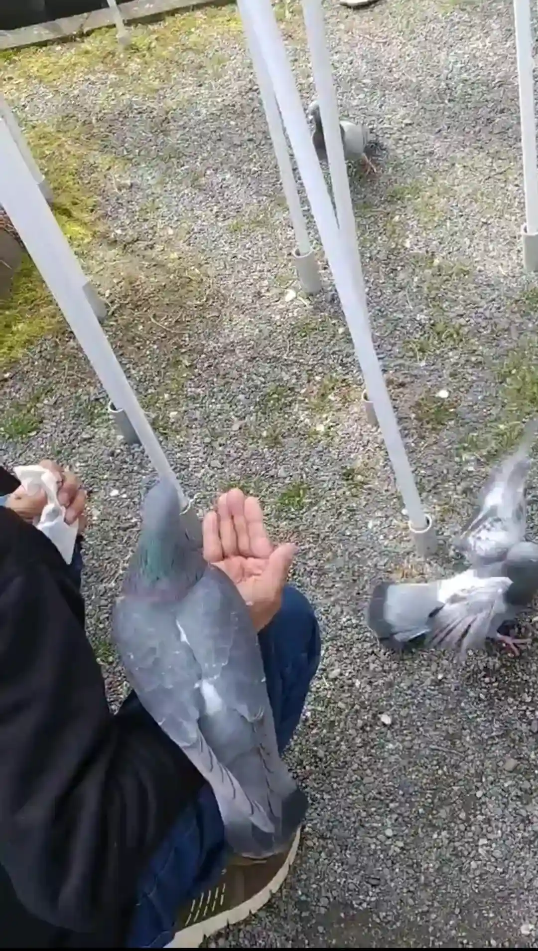 鳩が手の上に乗って餌を食べに来て可愛かったです