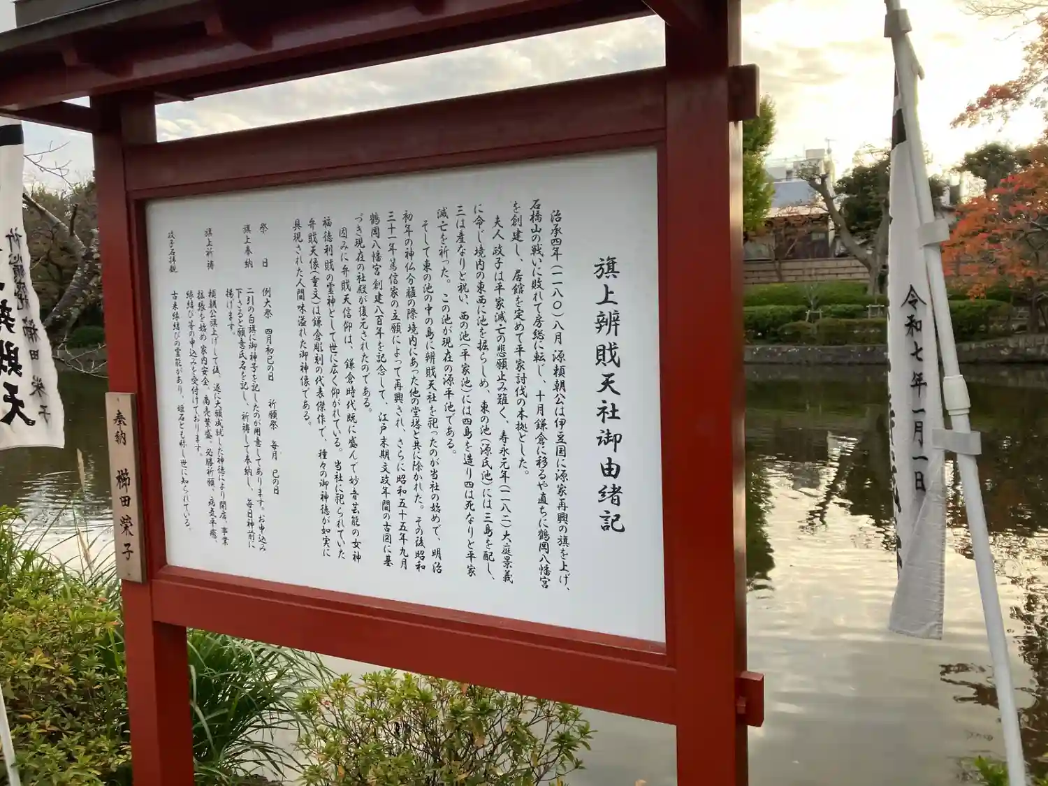 旗上弁財天は、鶴岡八幡宮の源氏池に浮かぶ島にあり、源氏の歴史と深く結びついた神聖な場所として信仰さ…