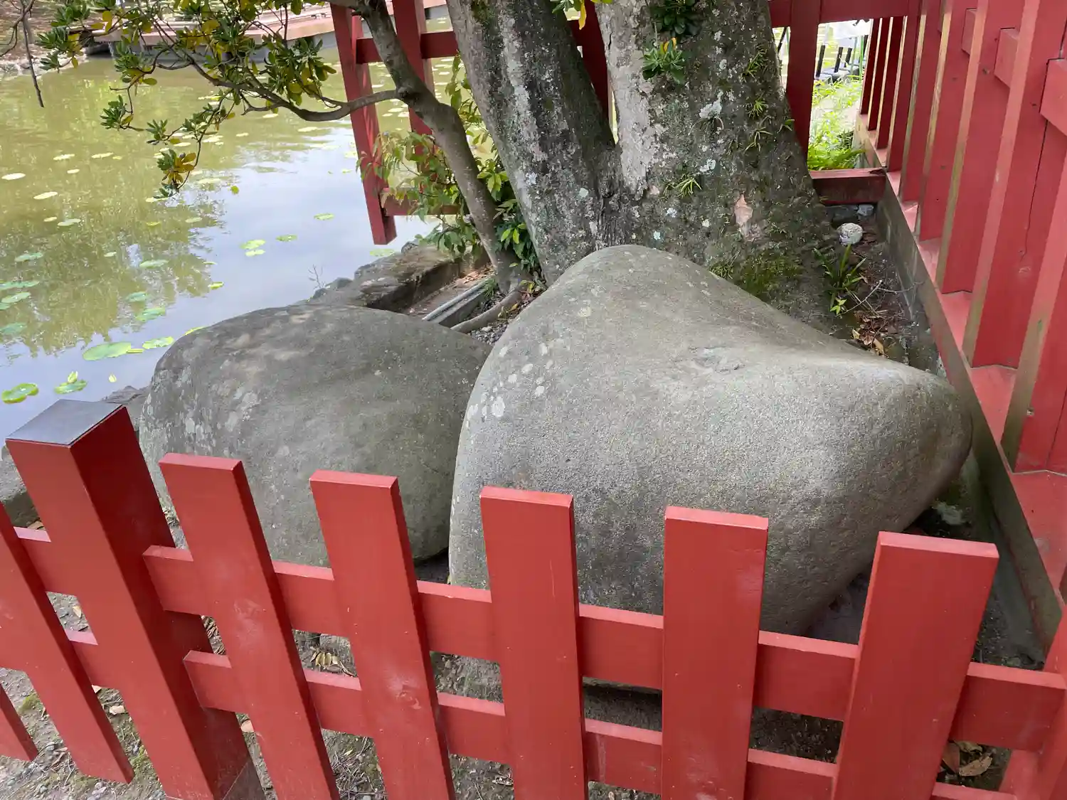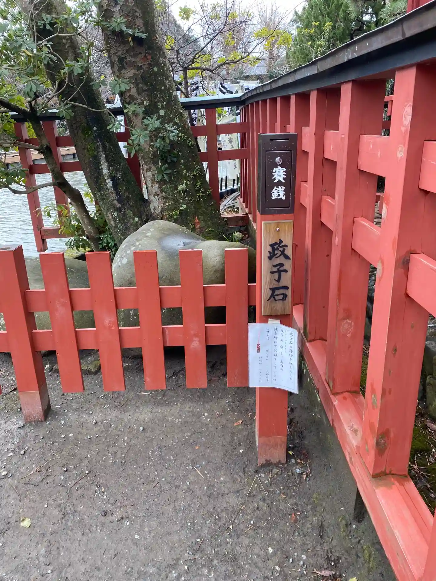源氏池の旗上弁財天社には夫婦円満、良縁、子宝の祈願石「政子石」があります