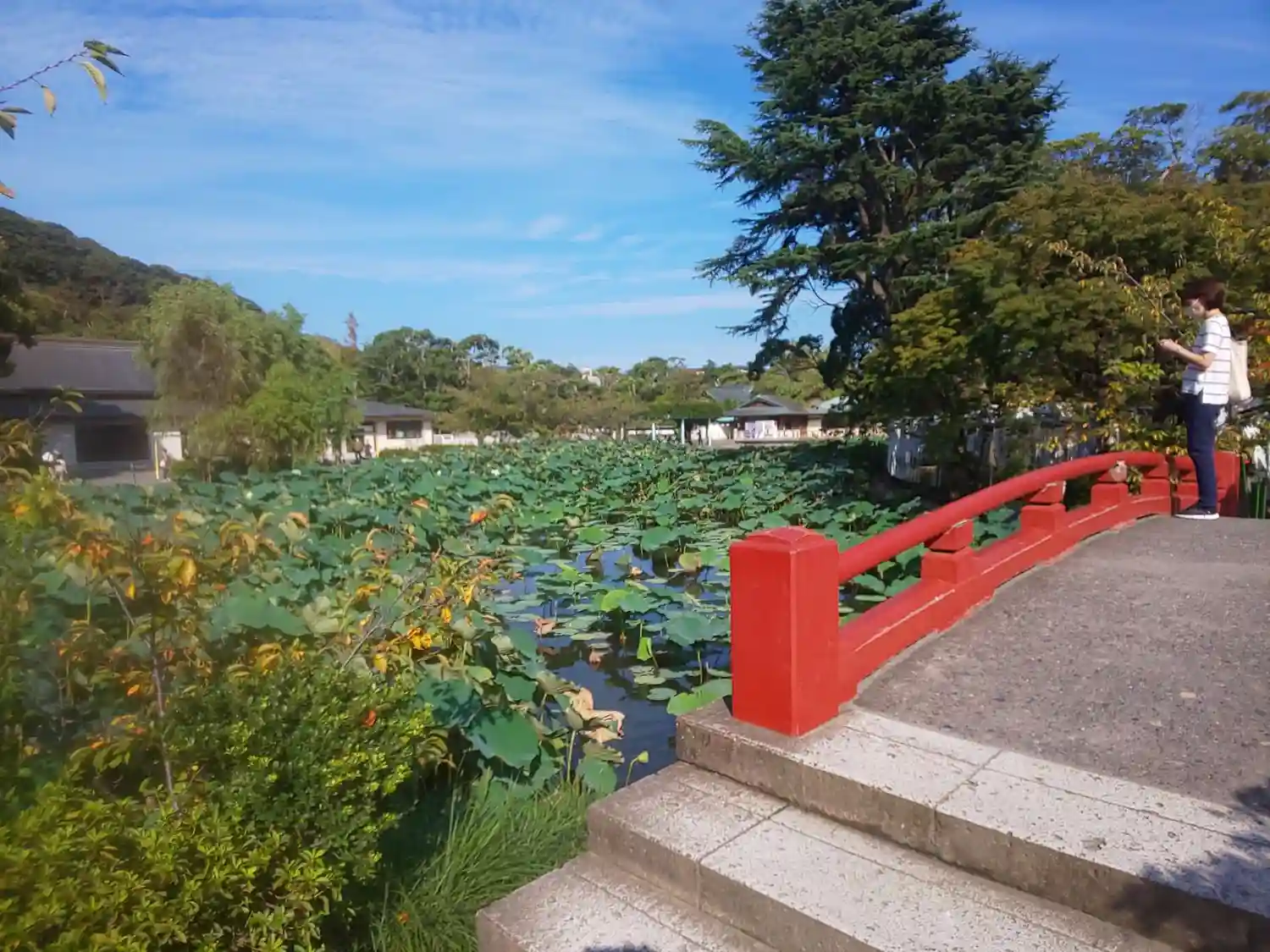 蓮の葉が美しい橋を渡り、鎌倉七福神の弁天さまの御朱印をいた…