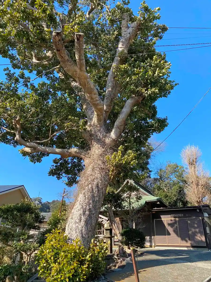 当社は、JR鎌倉駅からバスで10分弱の<岐れ道>バス停から600m北上した、緩やかな傾斜地にある。この地域は、源頼朝が開いた大倉幕府の西側の門があったことから<西御門>と呼ばれる。現在は傾斜地の閑静な住宅街。当社は来迎寺(西御門)の境内入口にあって、境内は住宅1軒ほどと狭いが、それに似合わない巨大な古木が立っている。