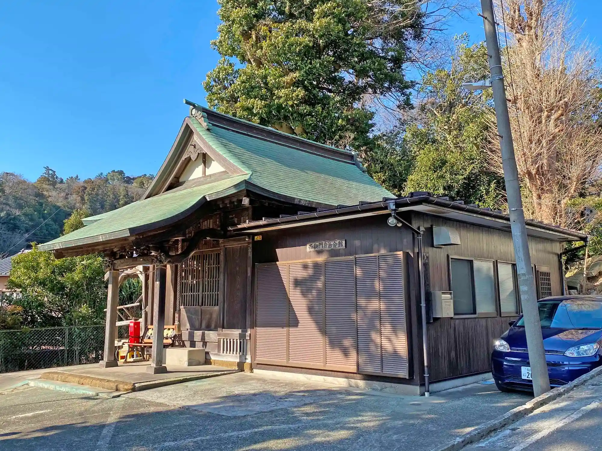 社殿全景。背後に別途本殿はないようで、右脇に<西御門自治会館>がくっついている。