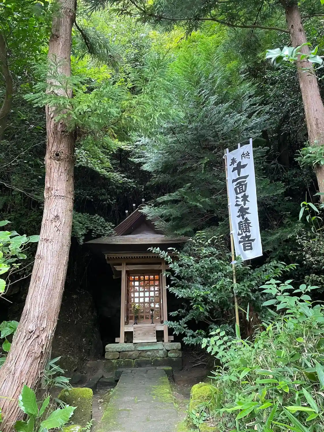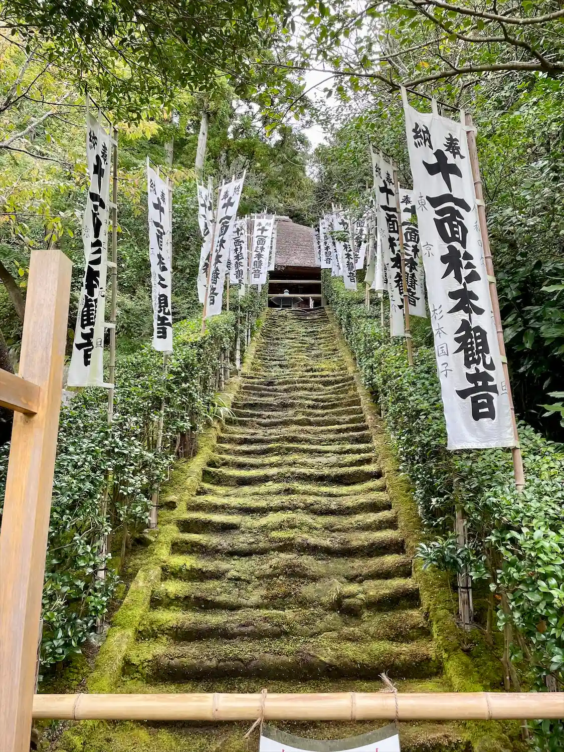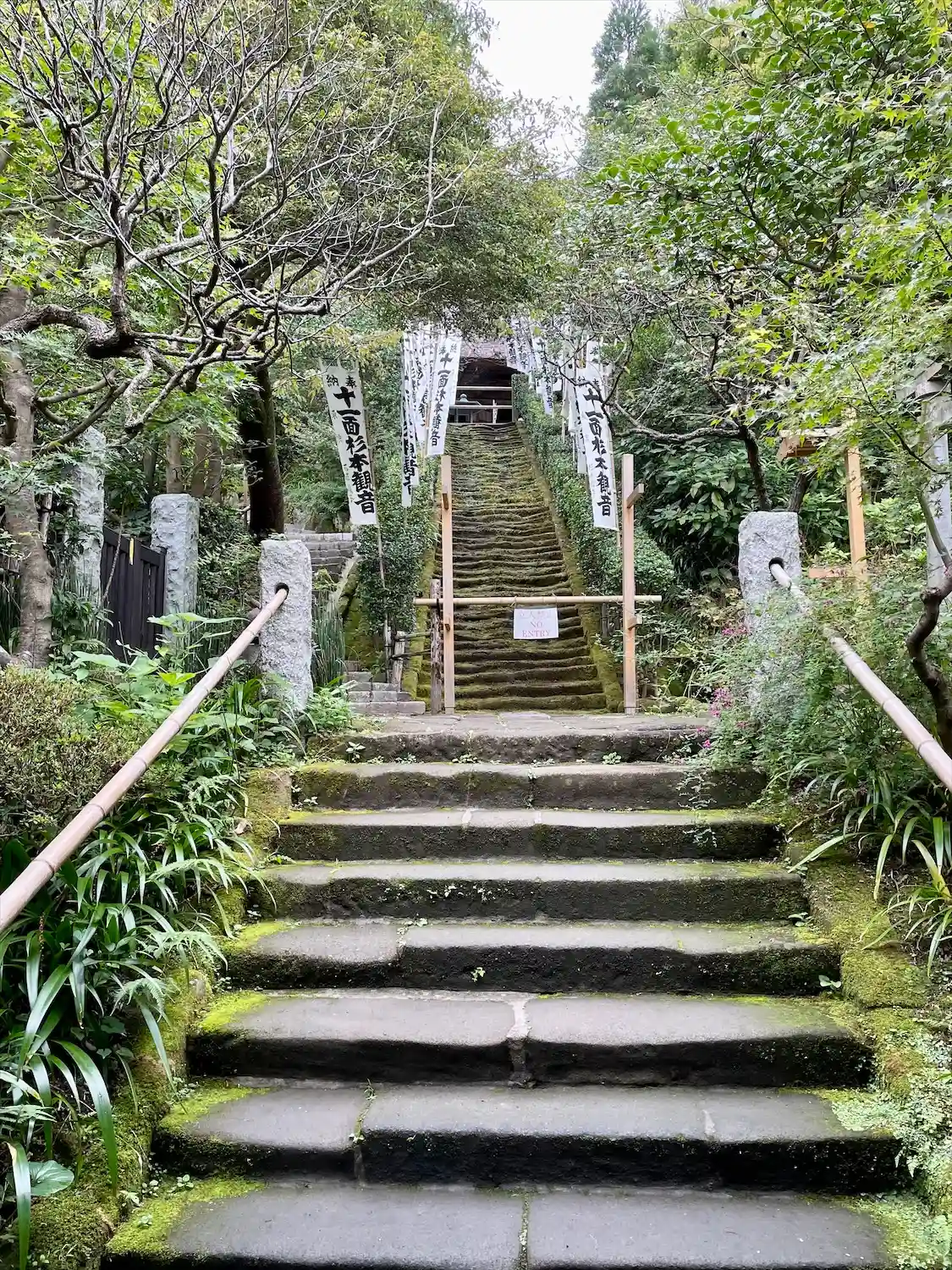 鎌倉最古の寺とされ、参道途中に苔むした石段があることでも知られている。
