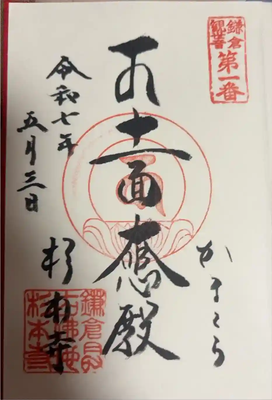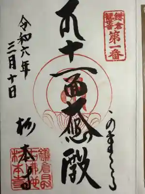 中央に十一面観音の梵字キャと十一面大悲殿、右下にかまくら、左下に杉本寺と書かれ、右上に坂東第一番の印、中心に梵字の印、左下に寺印が押されています。