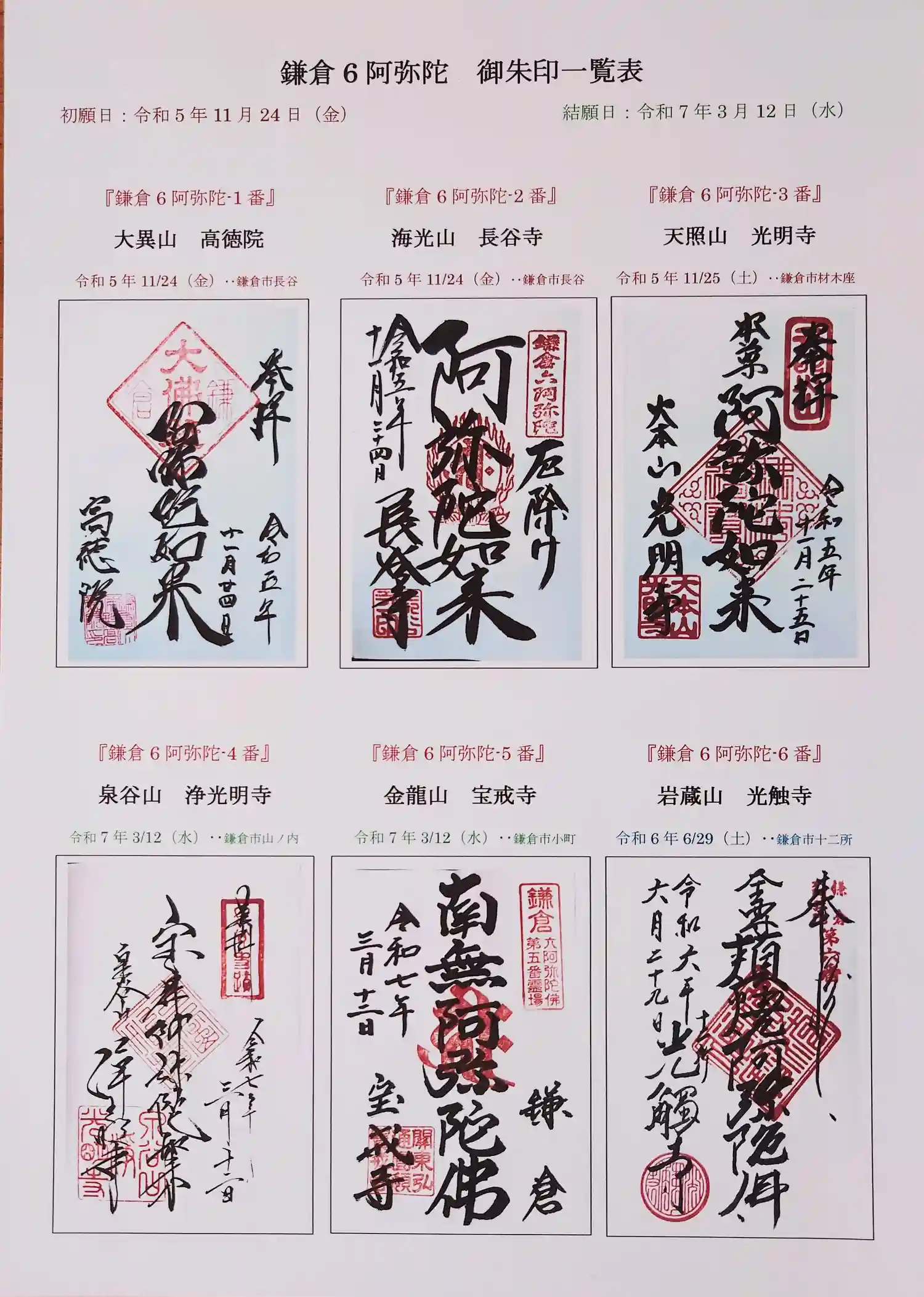 鎌倉六阿弥陀の御朱印一覧表