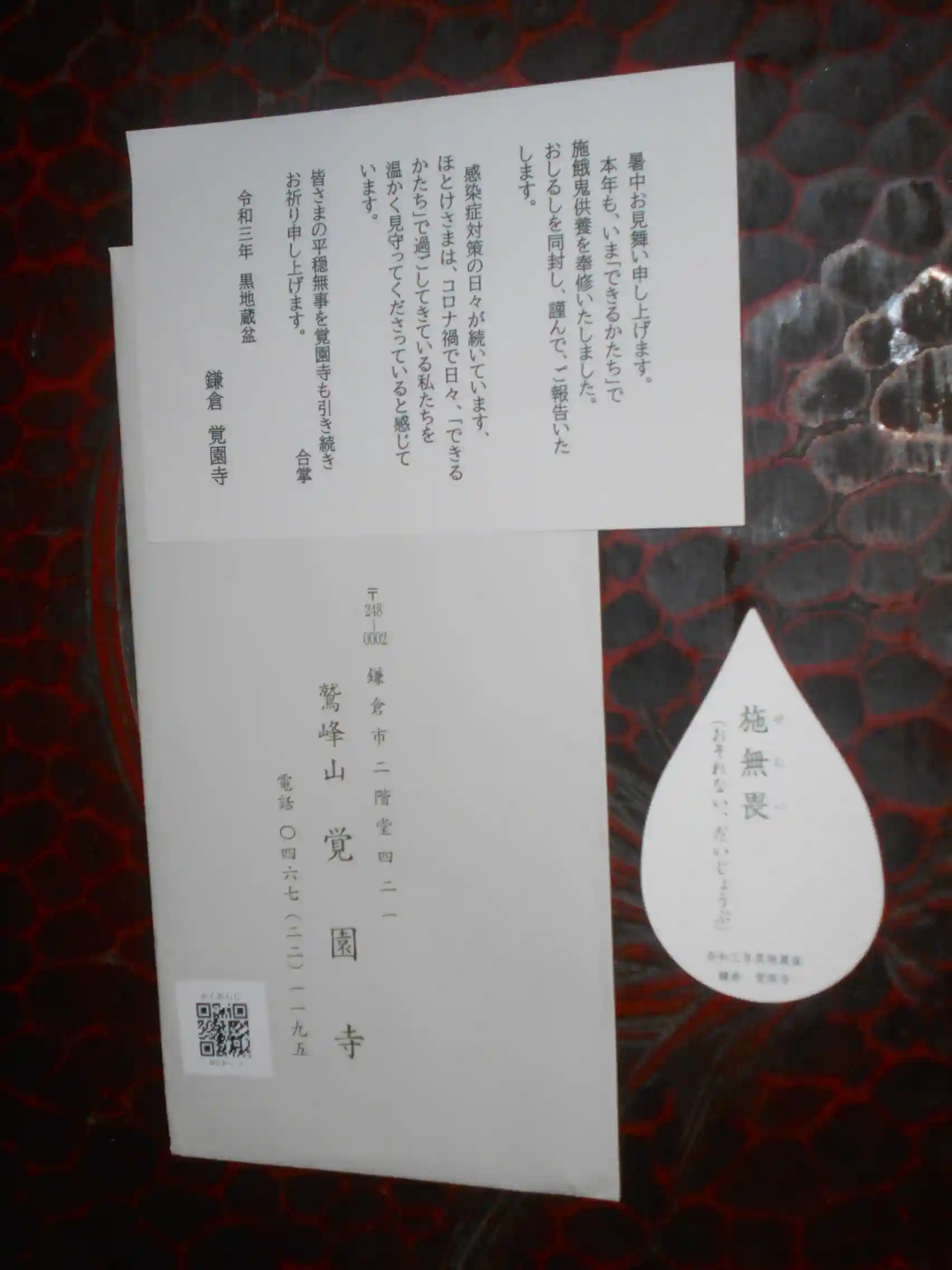 令和三年黒地蔵盆 鎌倉 覚園寺 ” と書かれている。