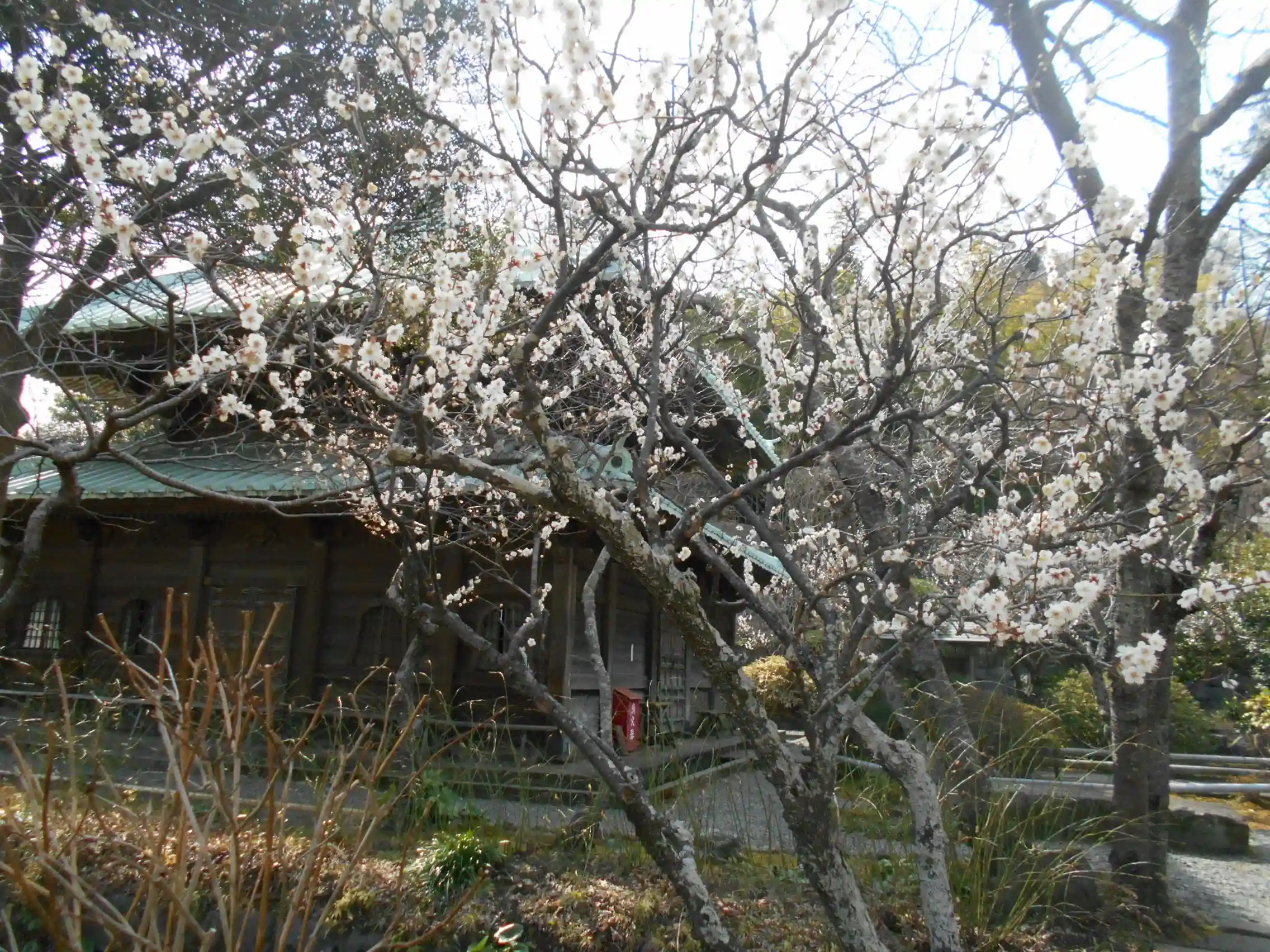 03-2) ’ 祠堂 ’(の鞘堂)前から振り返った右方、梅の花を仏殿前面方向。